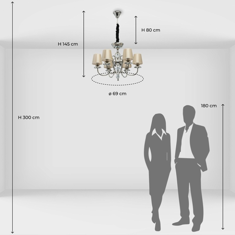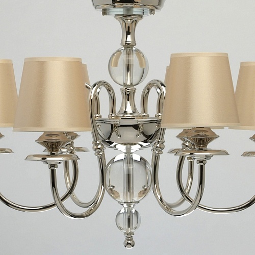 Металлическое основание гальванизировано в цвет хрома. Потолочная чаша, декоративные розетки, корпус, центральные стержень и декор на рожках изготовлены по технологии токарной обработки. Рожки изготовлены по технологии проката на роликовом станке. Декоративные элементы на центральном стержне выполнены из массива хрусталя. Абажуры выполнены из атласного текстиля бежевого цвета с термостойким акрилом внутри. Абажуры прошиты.
