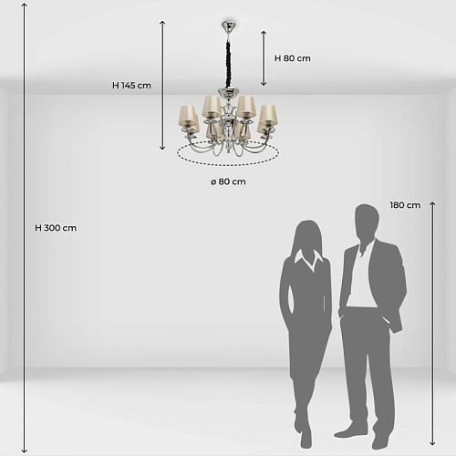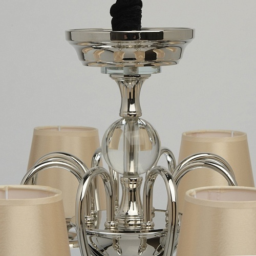 Металлическое основание гальванизировано в цвет хрома. Потолочная чаша, декоративные розетки, корпус, центральные стержень и декор на рожках изготовлены по технологии токарной обработки. Рожки изготовлены по технологии проката на роликовом станке. Декоративные элементы на центральном стержне выполнены из массива хрусталя. Абажуры выполнены из атласного текстиля бежевого цвета с термостойким акрилом внутри. Абажуры прошиты.