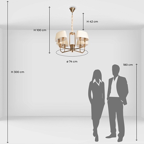 Металлическое основание гальванизировано в цвет матового золота. Заменяемые источники света закрыты двойными текстильными абажурами бежевого цвета, отделанными кантами сверху и снизу.