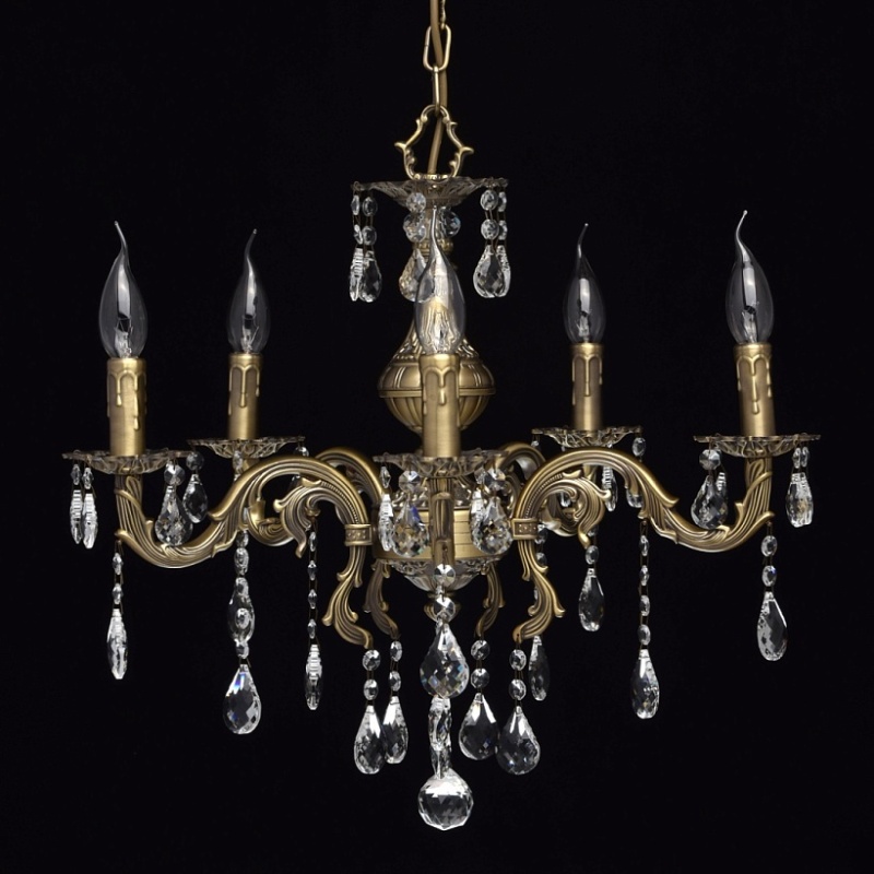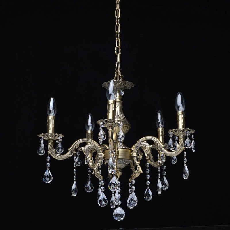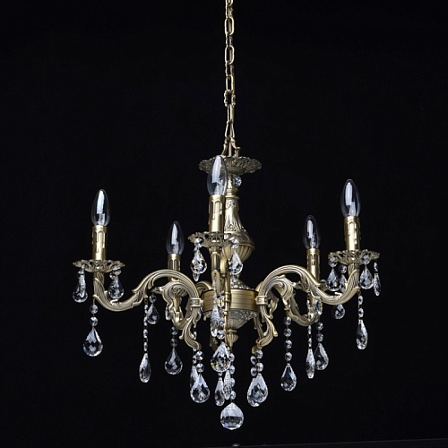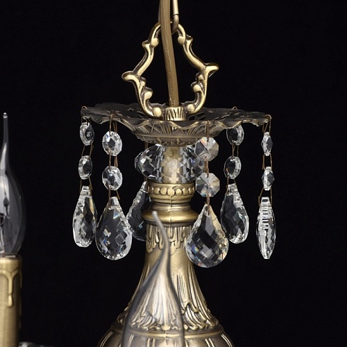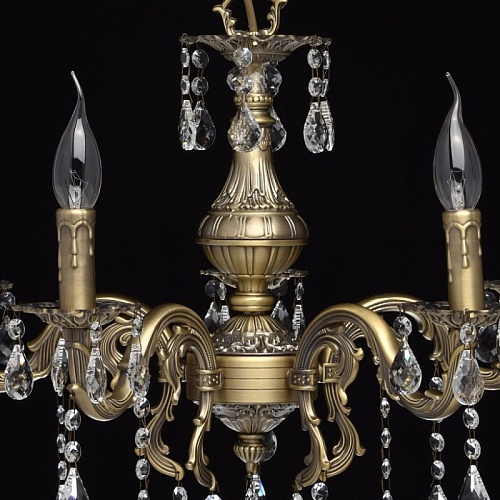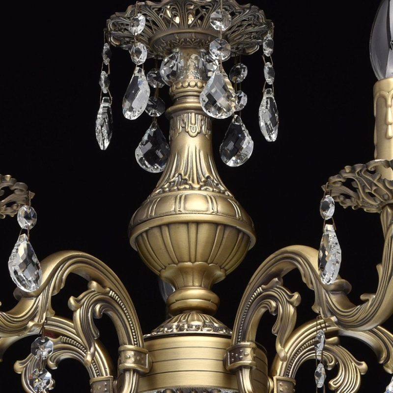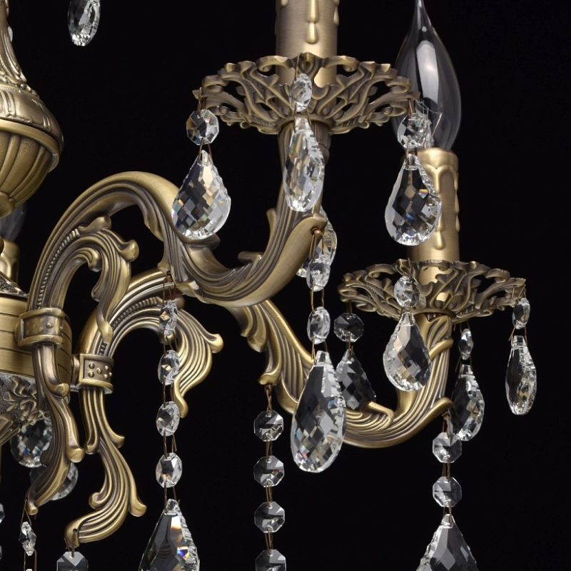 Арматура светильника выполнена из комбинации сплавов металлов и гальванизирована в цвет бронзы с последующим патинированием. Основание светильника выполнено из сплава железа по технологии прессования. Рожки, центральная ось и декоративные розетки выполнены из сплава алюминия с цинком по технологии художественного литья в кокиль под давлением. Светильник декорирован подвесками из хрусталя категории "a-grade" сложной огранки
