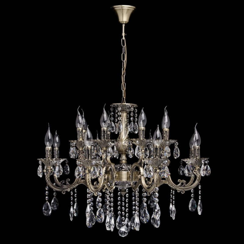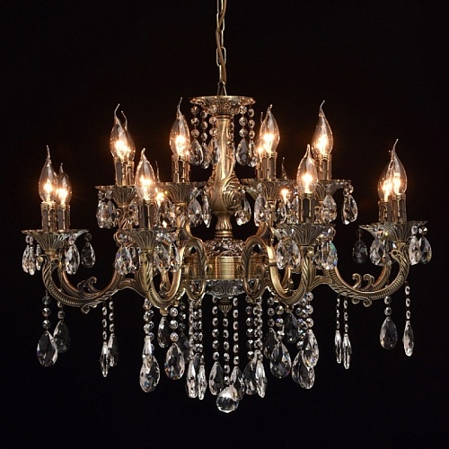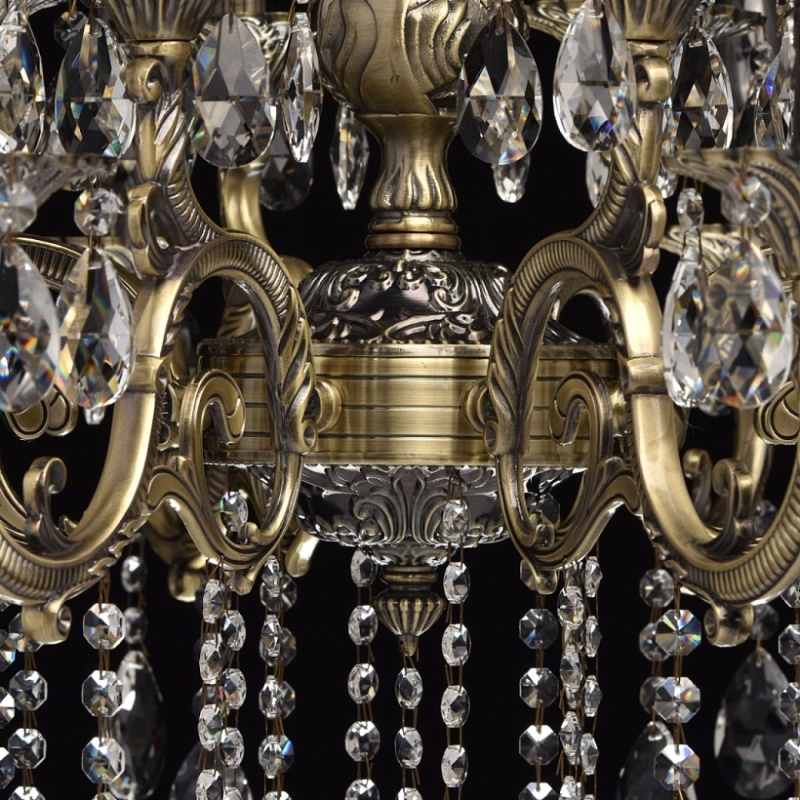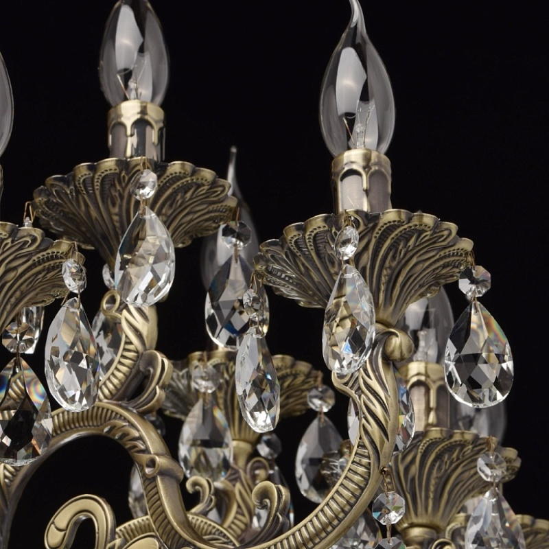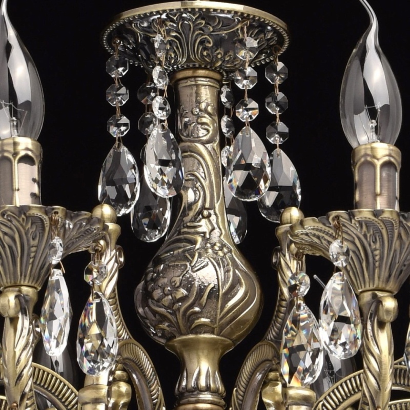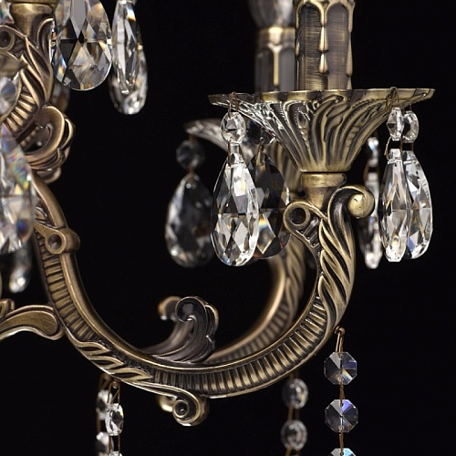 Арматура светильника выполнена из комбинации сплавов металлов и гальванизирована в цвет античной бронзы, с последующим патинированием и лакированием. Основание выполнено из металла по технологии прессования. Рожки и центральная часть выполнены из сплава алюмининия по технологии художественного литья. Декор: подвески из прозрачного хрусталя 4 видов в форме октагонов, миндаля и шара.