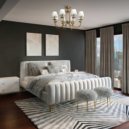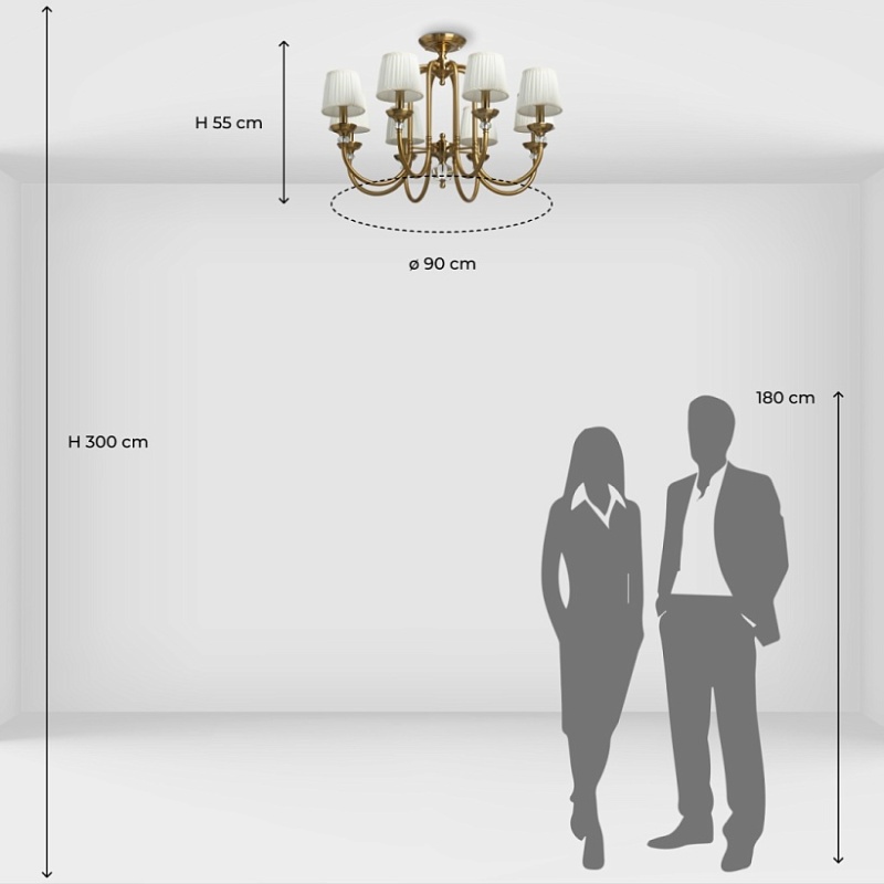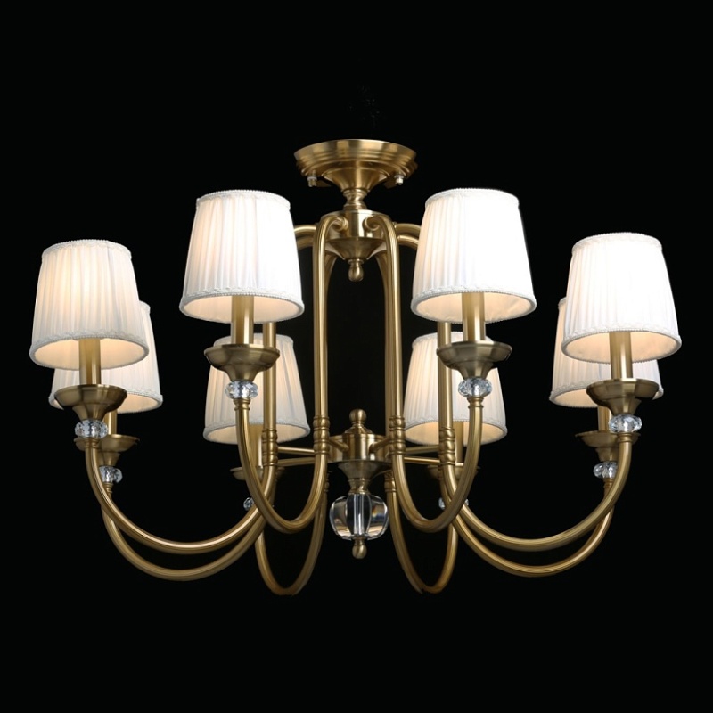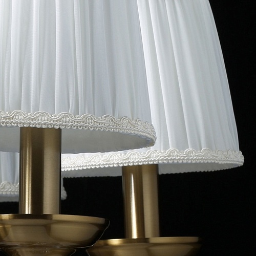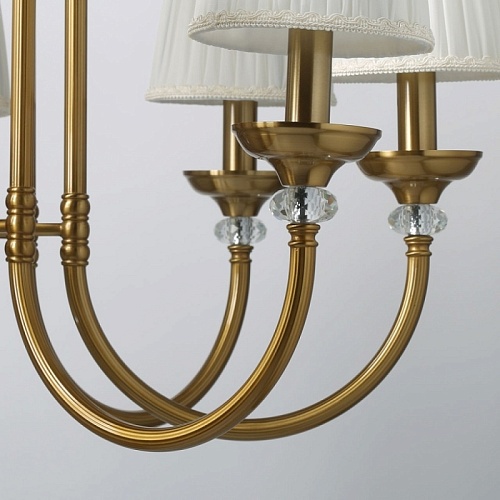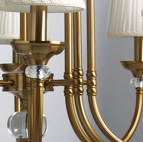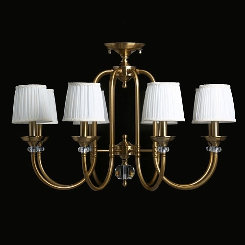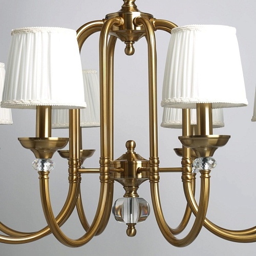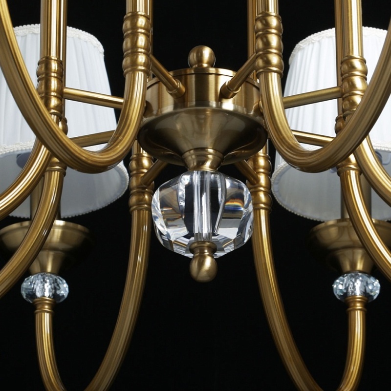 Металлическое основание потолочной люстры гальванизировано в цвет медовой бронзы. Источники света закрыты белыми текстильными абажурами. Люстра декорирована массивами хрусталя.