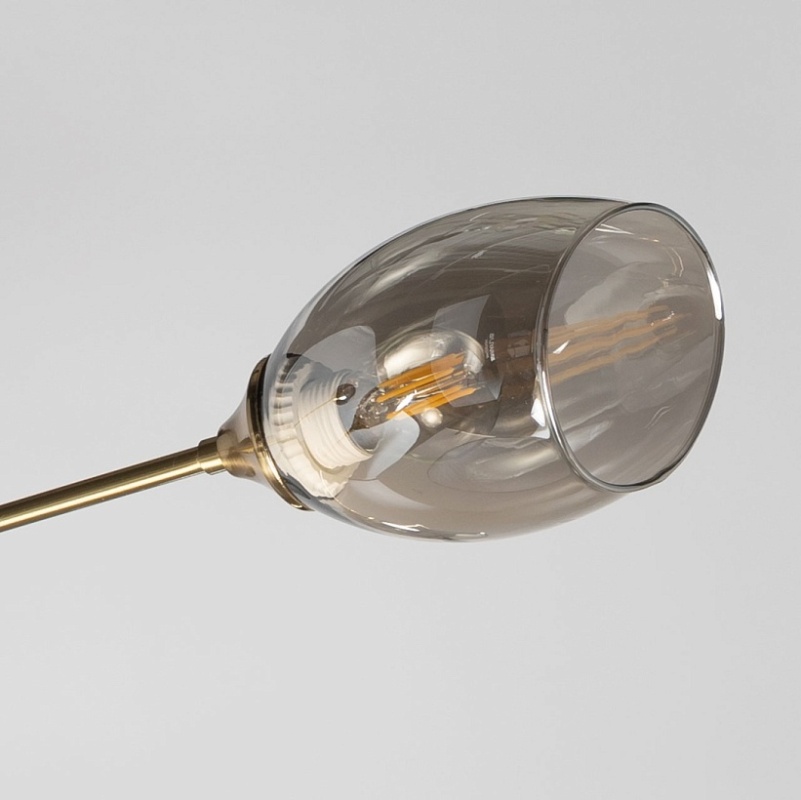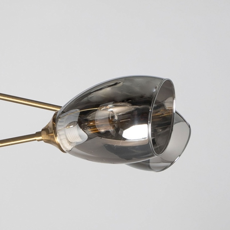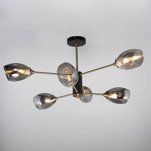 Металлическое основание потолочной люстры гальванизировано в цвет античной бронзы. Отдельные элементы основания окрашены в черный цвет. Потолочная люстра декорирована стеклянными плафонами, гальванизированными в дымчатый металлизированный цвет.