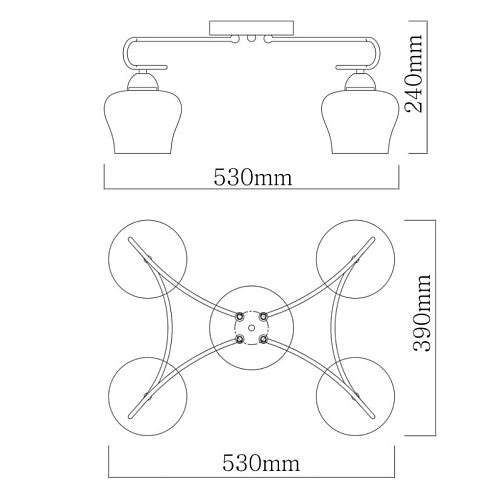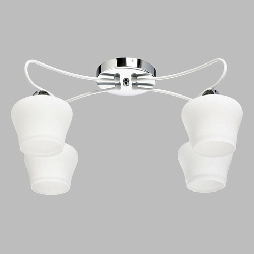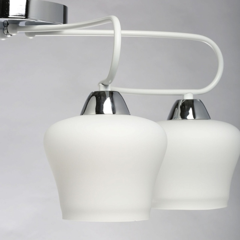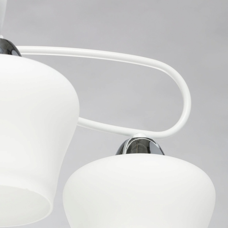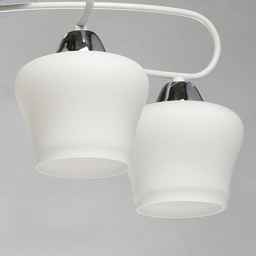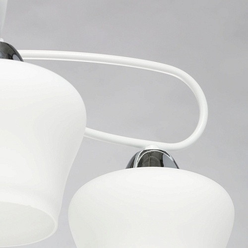 Основание светильника выполнено из металла. Потолочная чаша и держатели плафонов гальванизированы в цвет хрома, рожки окрашены в белый цвет. Стеклянные плафоны выдуваются вручную в форму и окрашены в белый цвет.