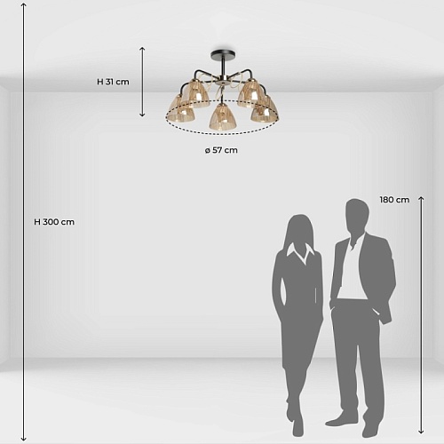 Металлическое основание потолочного светильника окрашено в черный цвет. Отдельные элементы гальванизированы в цвет золота. Стеклянные плафоны выдуваются в сложную форму и гальванизированы в цвет шампань
