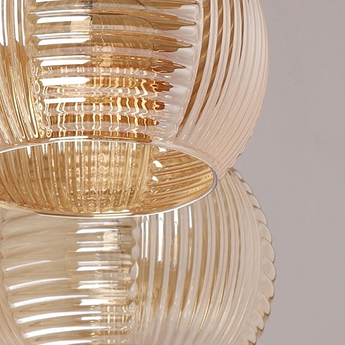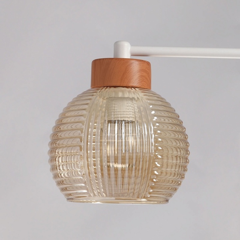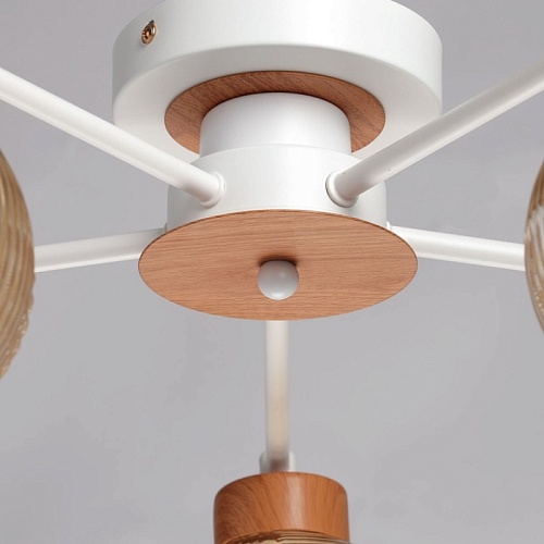 Металлическое основание потолочной люстры окрашено в белый цвет. Фактурные стеклянные плафоны, гальванизированные в цвет коньяк, выдуваются в форму вручную. Люстра декорирована металлическими элементами, имитирующими светлое дерево по технологии иммерсионной печати.