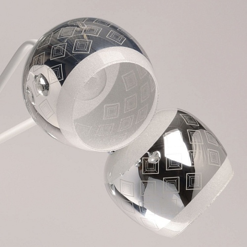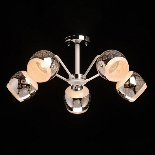 Металлическое основание потолочной люстры окрашено в белый цвет. Отдельные элементы основания гальванизированы в цвет хрома. Выдувные вручную стеклянные плафоны гальванизированы в дымчатый цвет и окрашены в белый цвет по трафарету. Край плафонов оплавлен. С внутренней стороны плафоны декорированы белой стеклянной крошкой.
