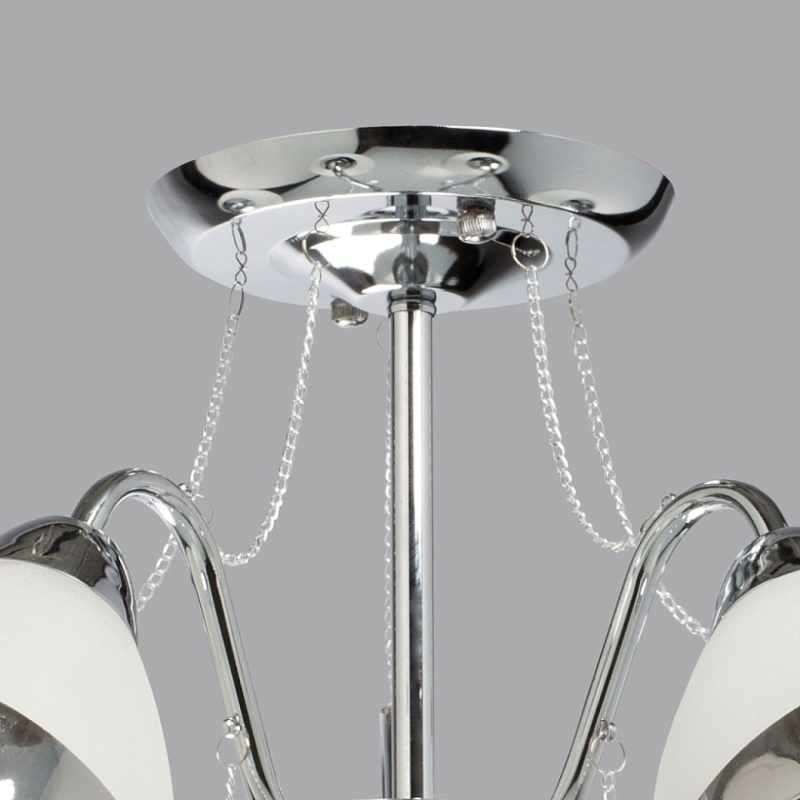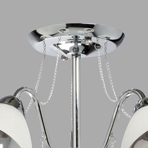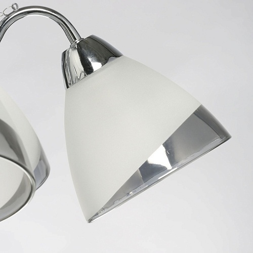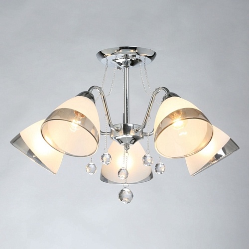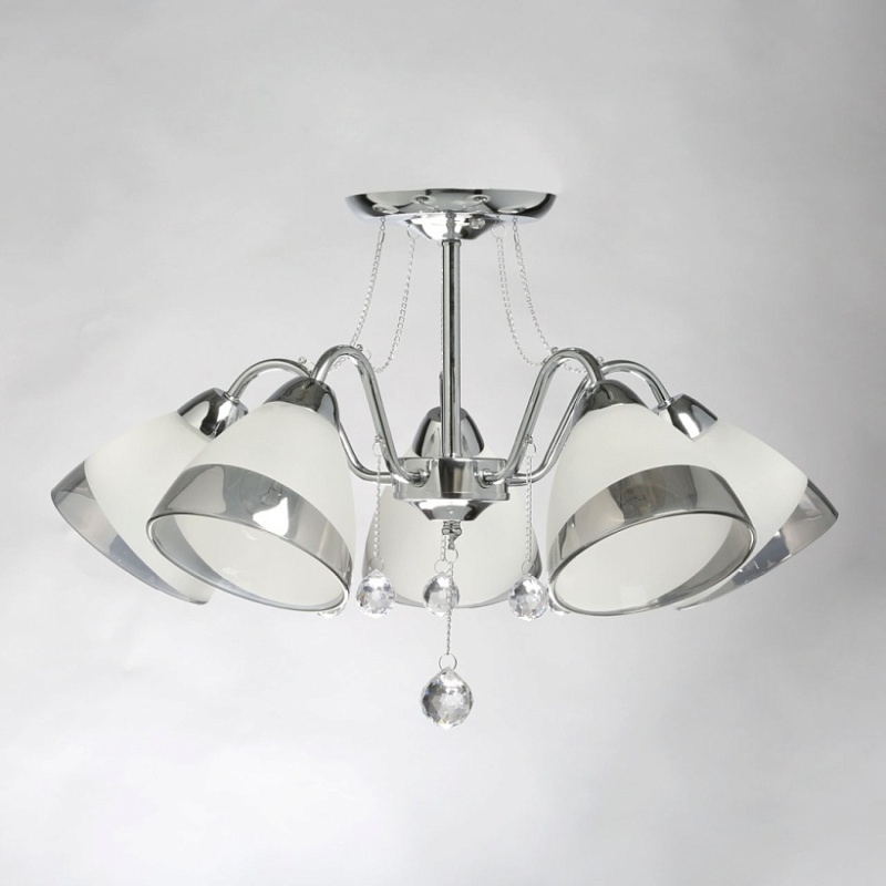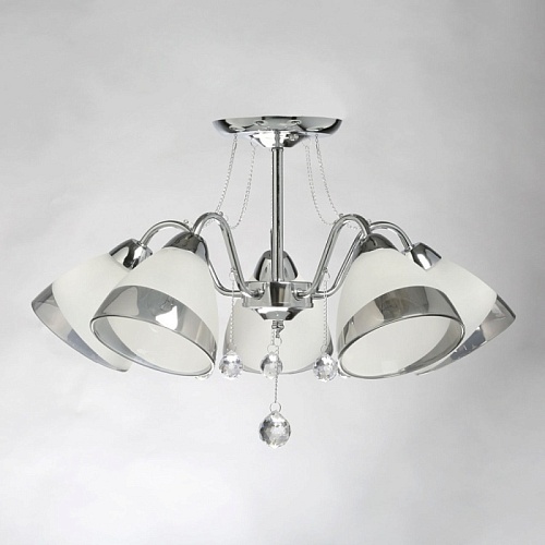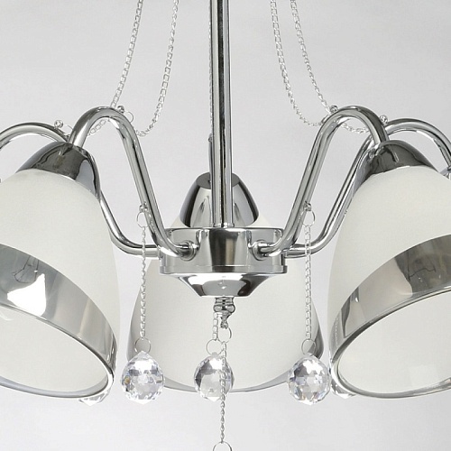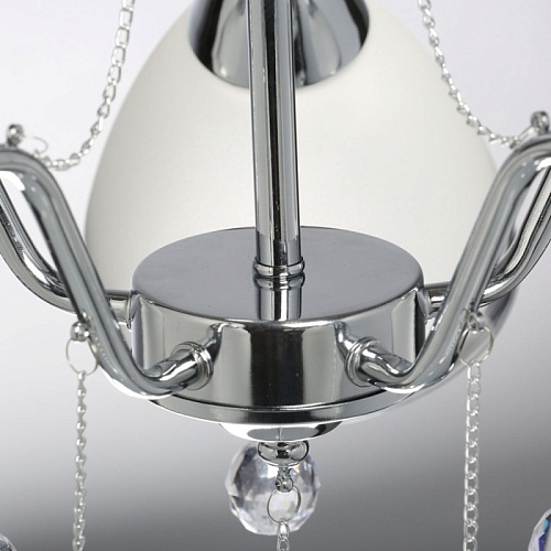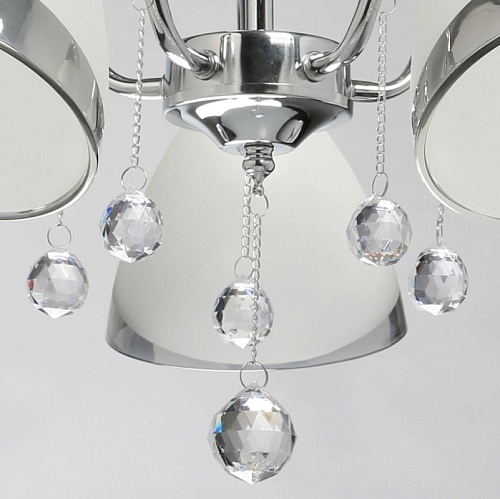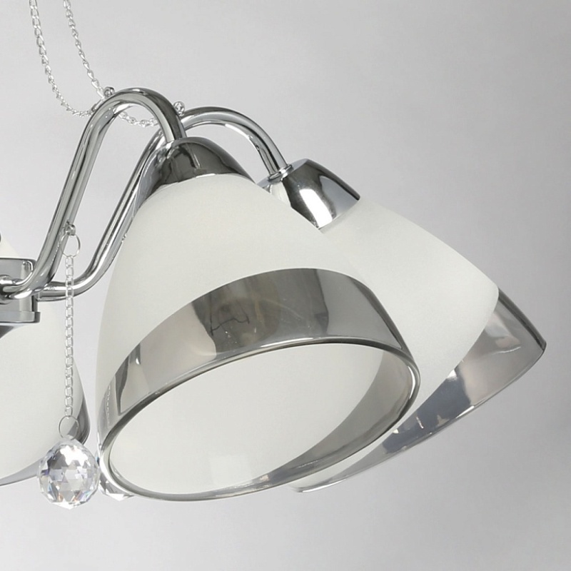 Металлическое основание гальванизировано в цвет хрома. Стеклянные плафоны частично матированы, края плафонов гальванизированы в дымчатый цвет. Светильник декорирован прозрачным хрусталем в форме шара.