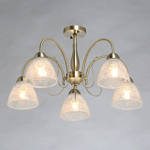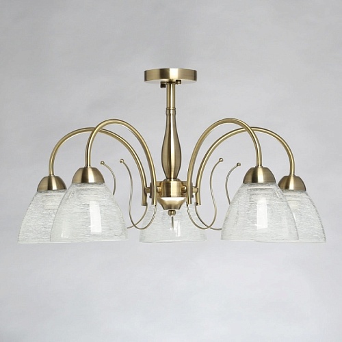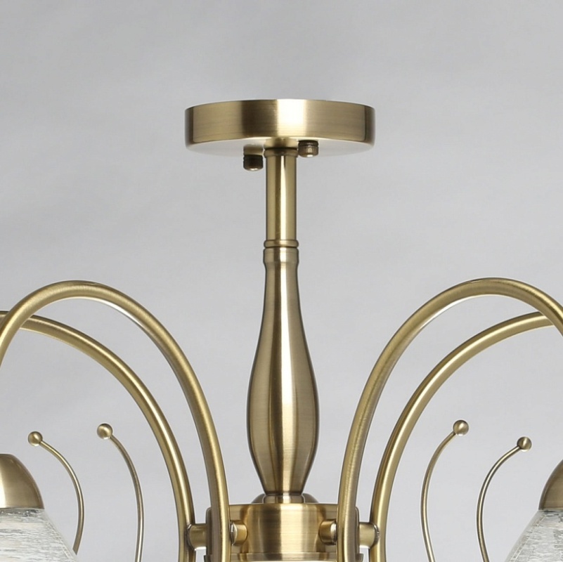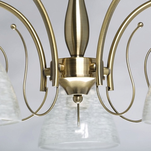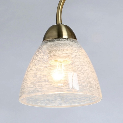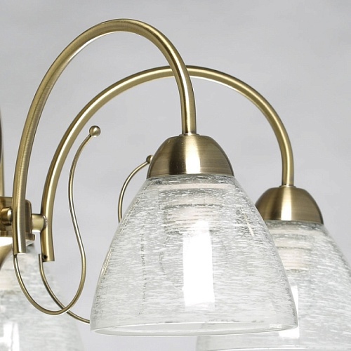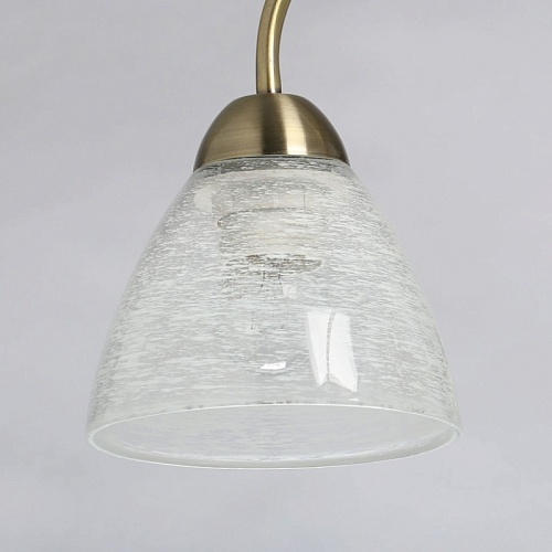 Металлическое основание светильника гальванизировано в цвет античной бронзы. На стеклянные плафоны нанесен рисунок белой краской в виде паутинки.