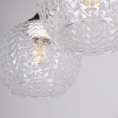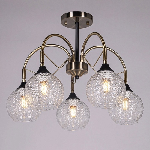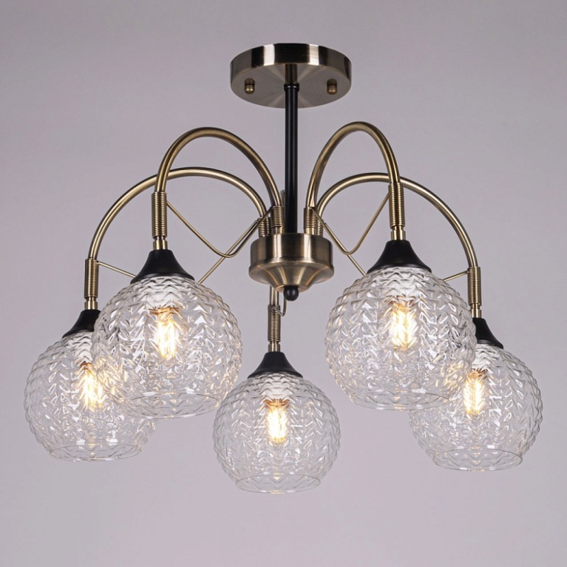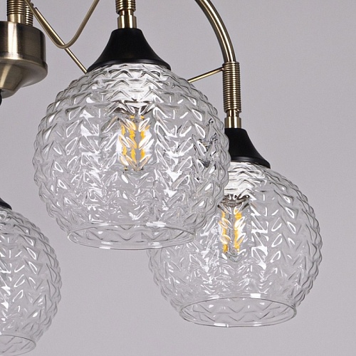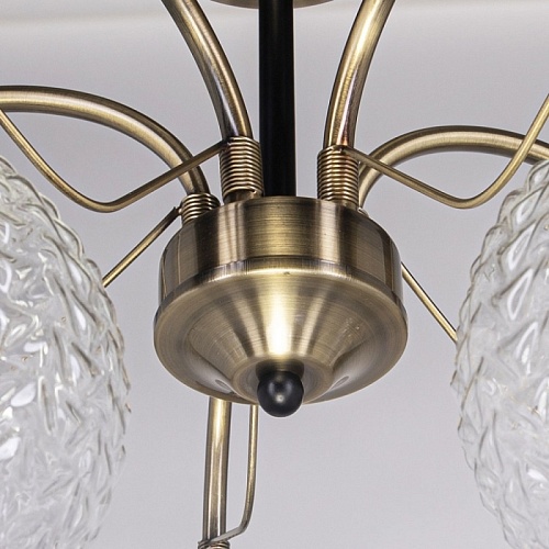 Металлическое основание потолочной люстры гальванизировано в цвет античной бронзы. Отдельные элементы основания окрашены в черный цвет. Потолочная люстра декорирована плафонами из фактурного стекла, отлитого в сложную форму.