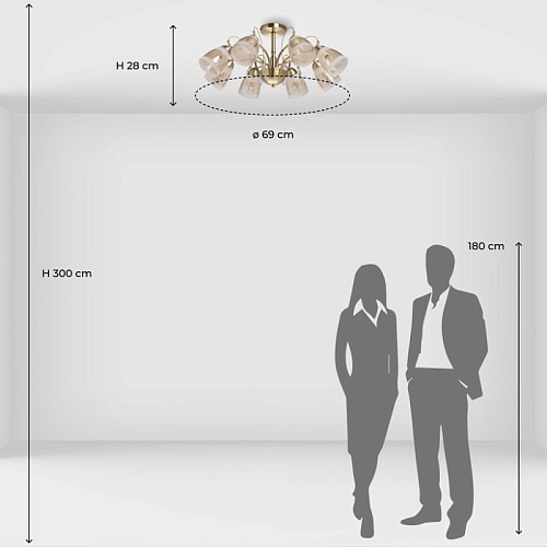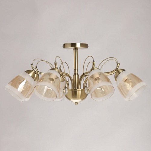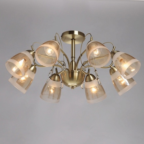 Металлическое основание потолочной люстры гальванизировано в цвет античной бронзы. Стеклянные плафоны матированы по трафарету и гальванизированы в цвет шампань. Люстра декорирована подвесками из прозрачного хрустального стекла.