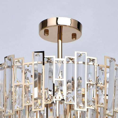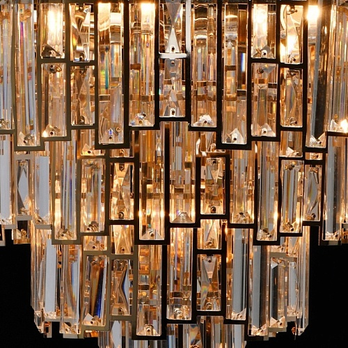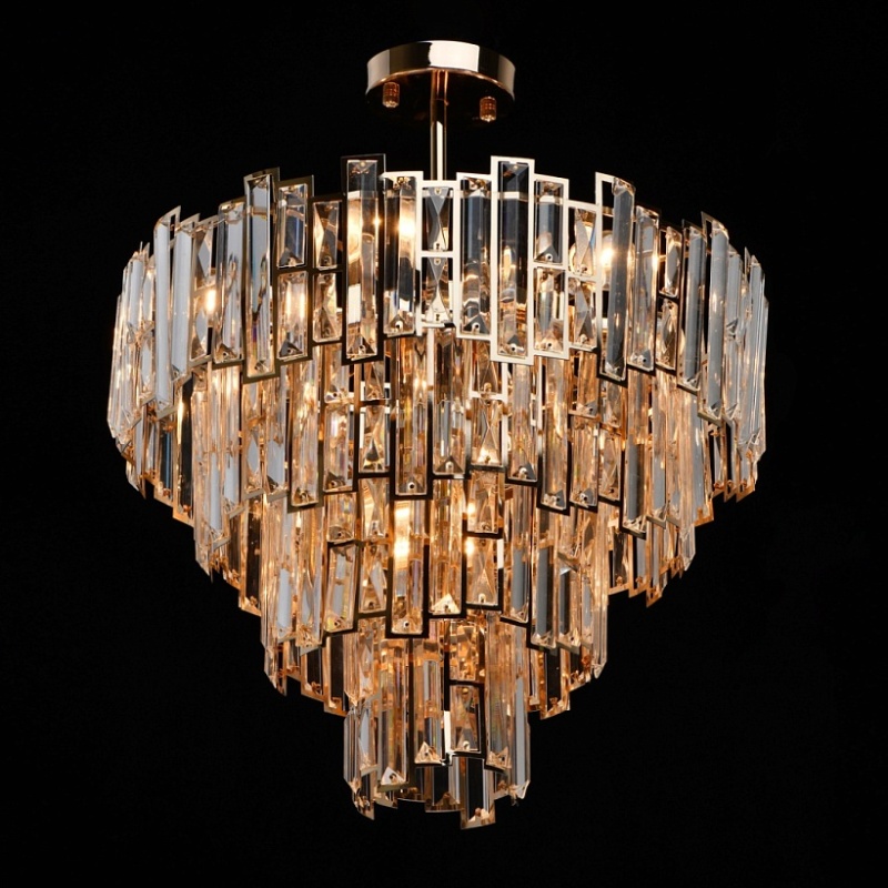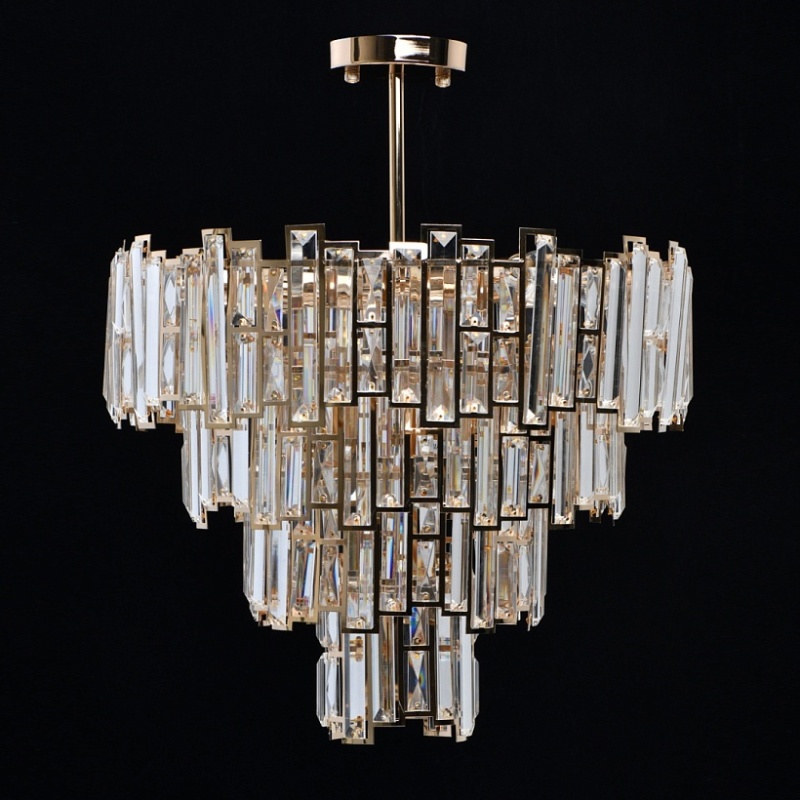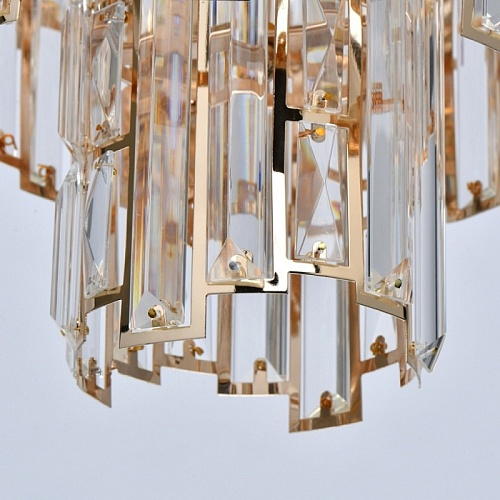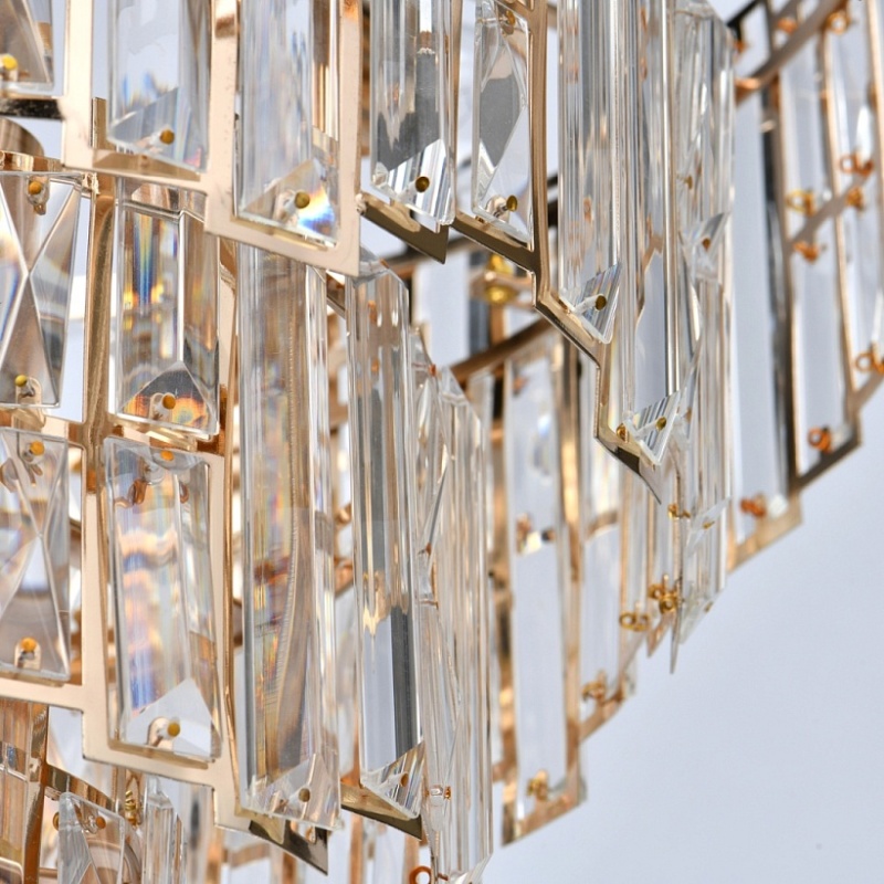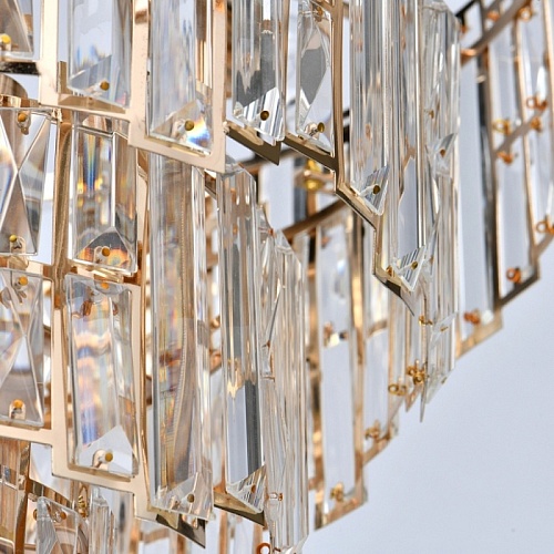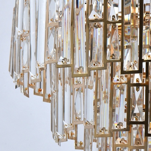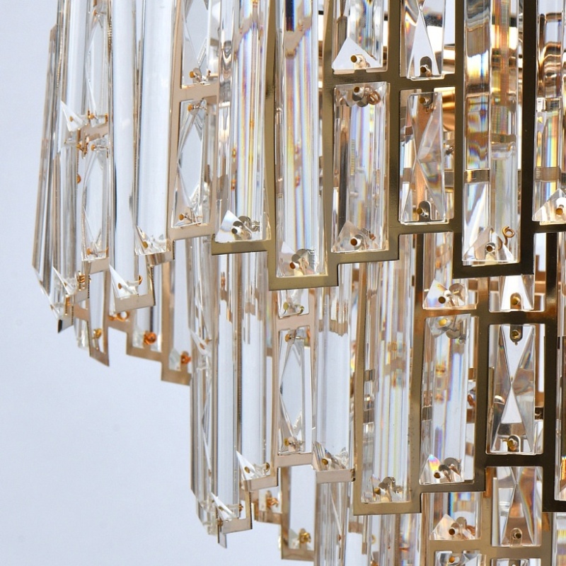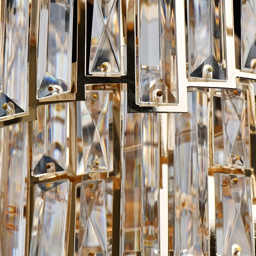 Основание светильника выполнено из металла и гальванизировано в цвет французского золота. Плафоны светильника вырезаны по технологии лазерной резки. Светильник декорирован прозрачным хрусталем прямоугольной формы.