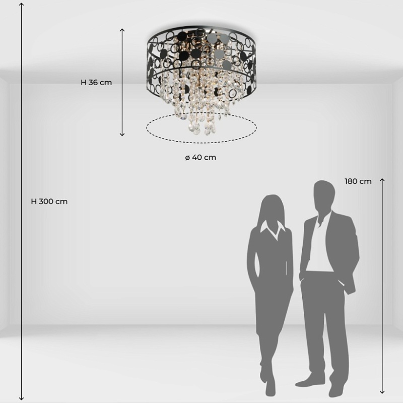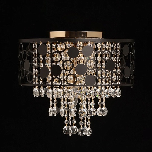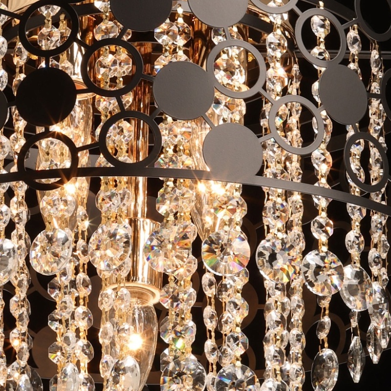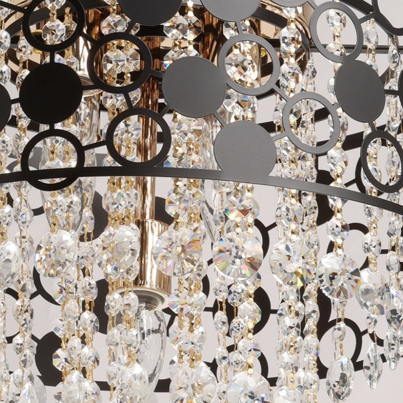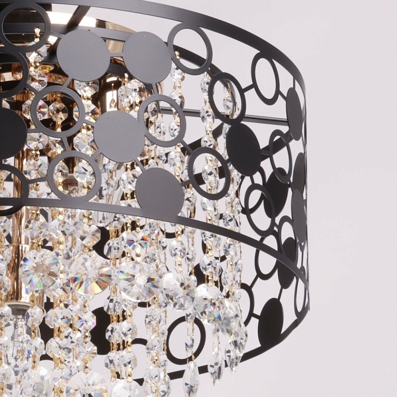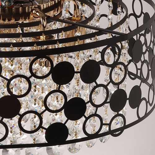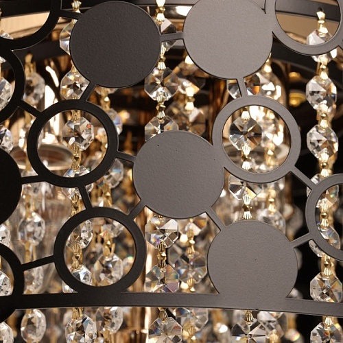 Металлическое основание светильника гальванизировано в цвет золота. Металлический плафон с геометричным орнаментом, выполненным по технологии лазерной резки, окрашен в черный цвет. Люстра декорирована прозрачным хрусталем круглой формы.