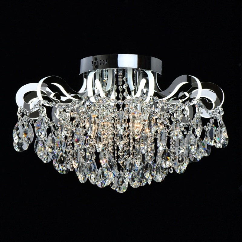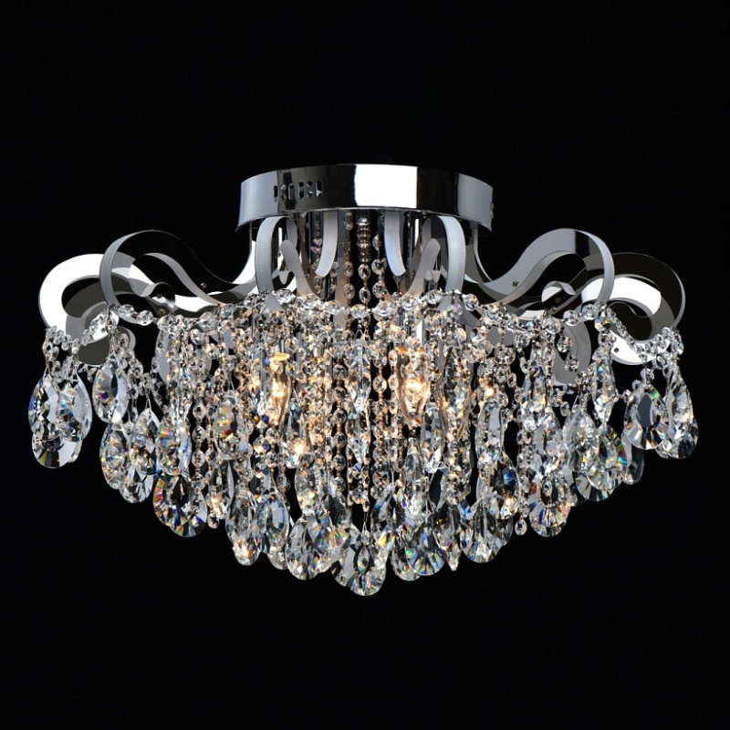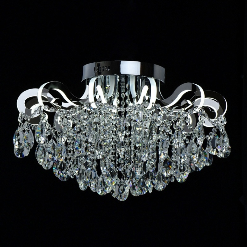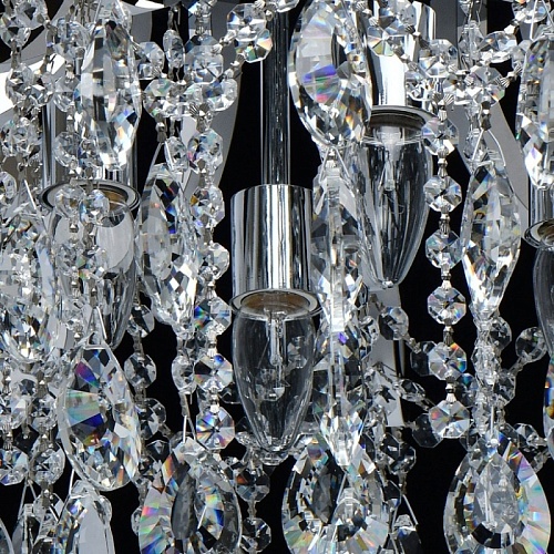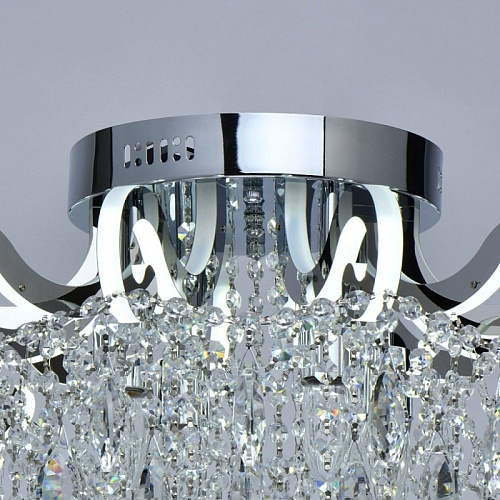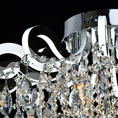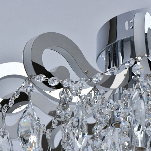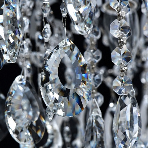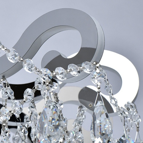 Основание светильника выполнено из металла и гальванизировано в цвет хрома. Рожки выполнены из нержавеющей стали и отполированы до зеркального блеска. Светодиодные источники света типа SMD Stripe закрыты белым матовым акрилом. Светильник декорирован прозрачным хрусталем формы октагон и миндаль.