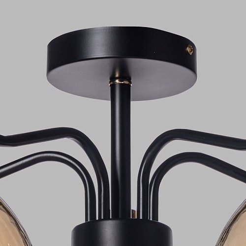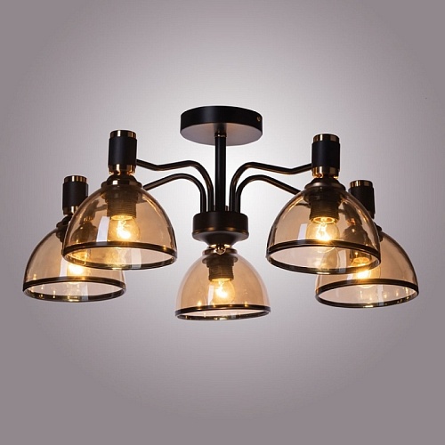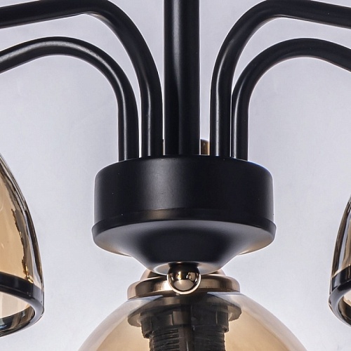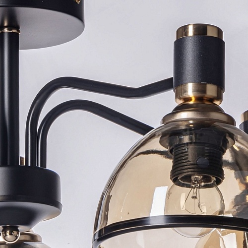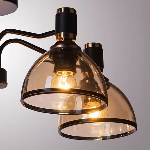 Металлическое основание потолочной люстры окрашено в черный цвет. Отдельные элементы основания гальванизированы в цвет золота. Потолочная люстра декорирована стеклянными плафонами, гальванизированными в цвет коньяк. Плафоны отделаны металлическим кантом черного цвета.