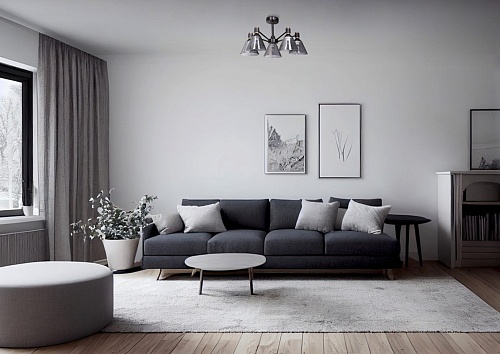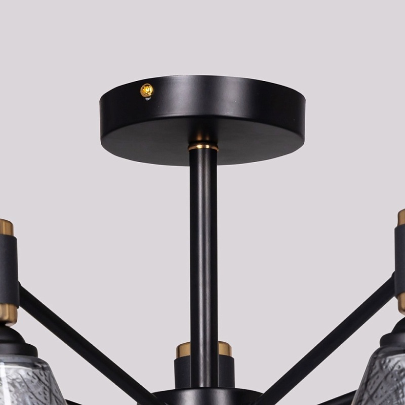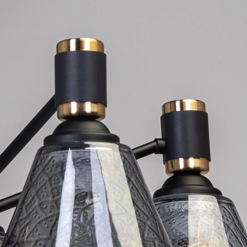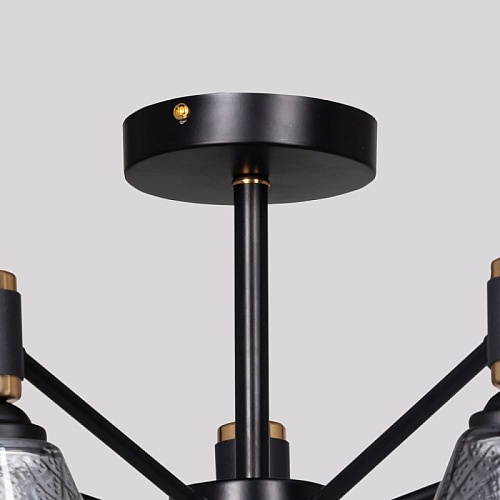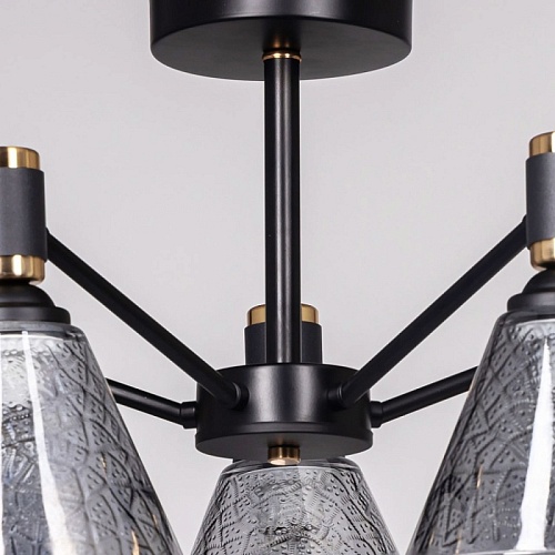 Металлическое основание потолочной люстры окрашено в черный цвет. Отдельные элементы основания гальванизированы в цвет золота. Потолочная люстра декорирована плафонами из фактурного стекла, гальванизированного в дымчатый металлизированный цвет.