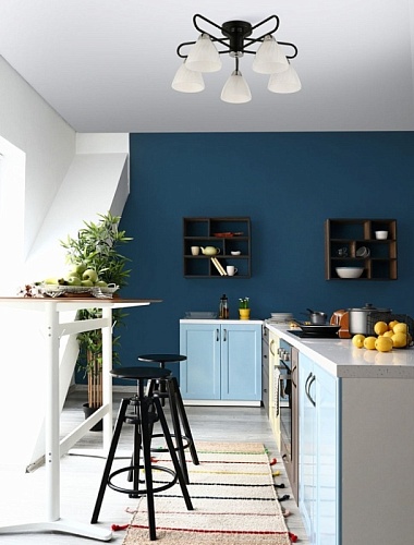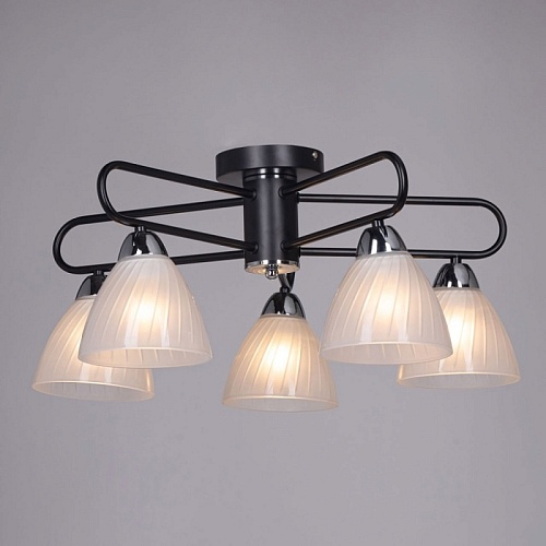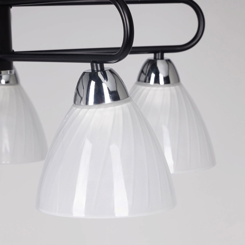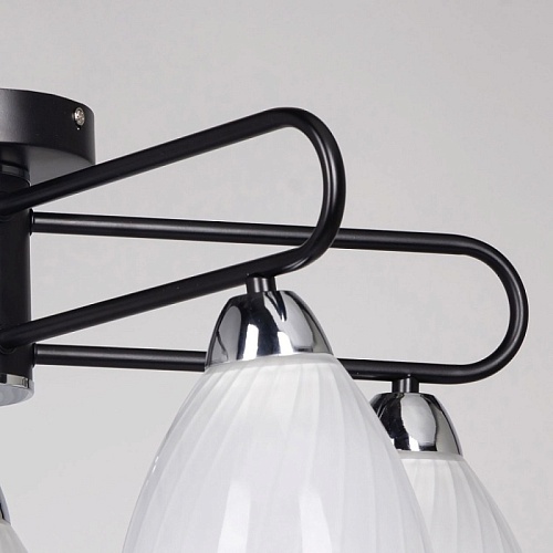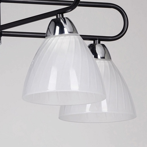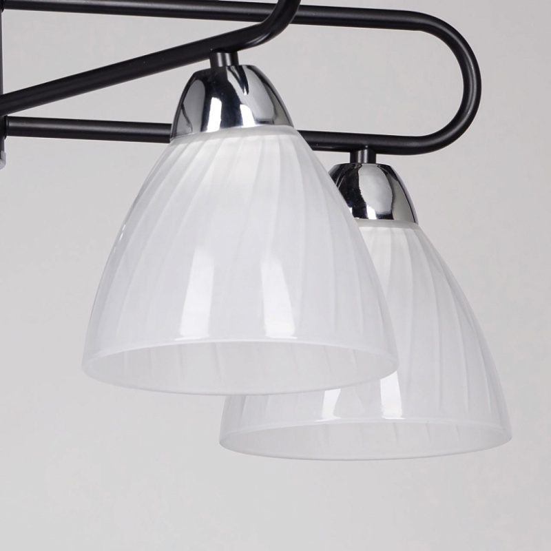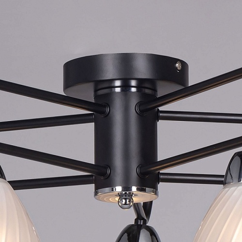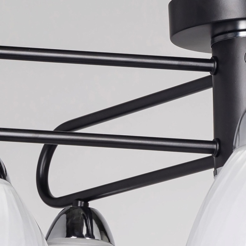 Металлическое основание потолочной люстры окрашено в черный цвет. Отдельные элементы основания гальванизированы в цвет хрома. Потолочная люстра декорирована стеклянными плафонами, отлитыми в сложную форму и матированными.