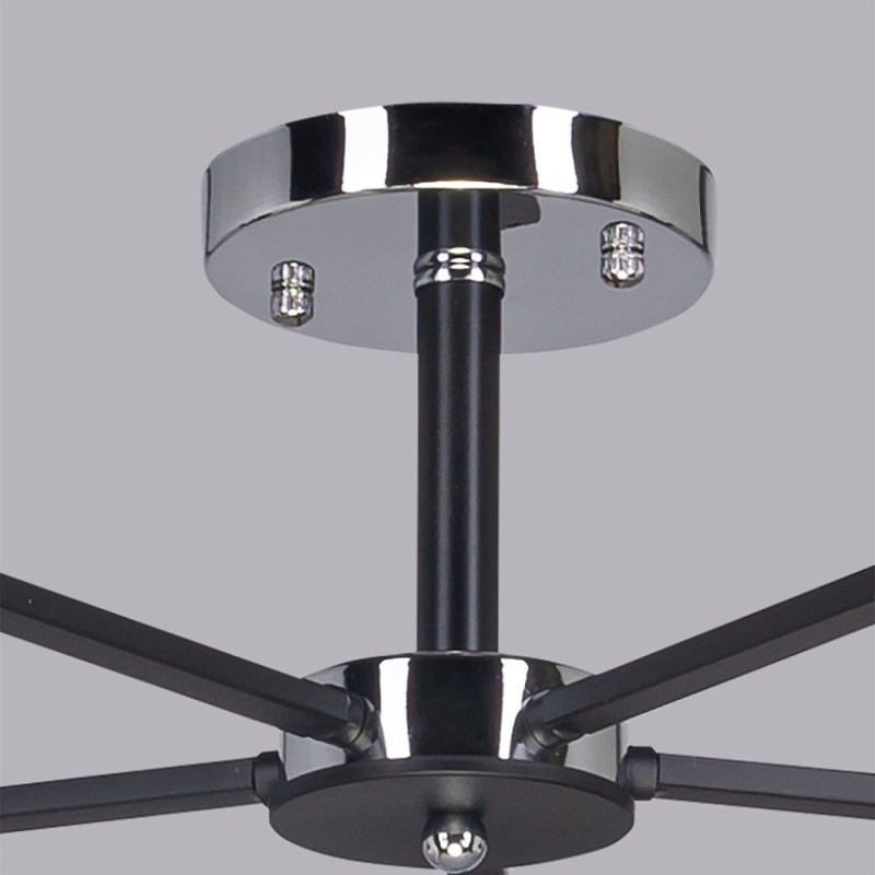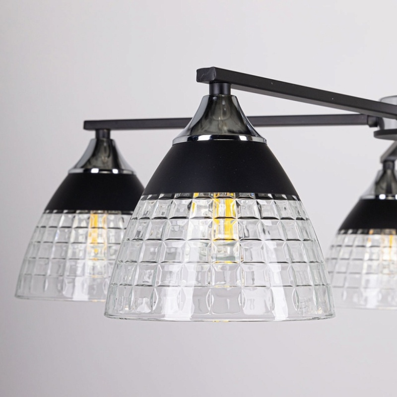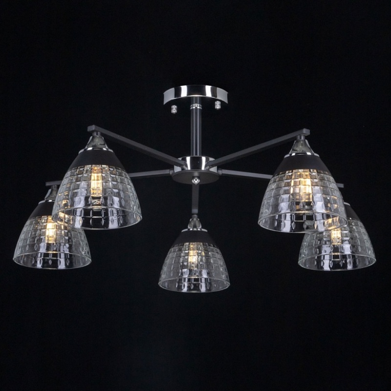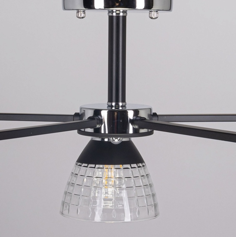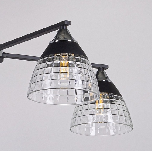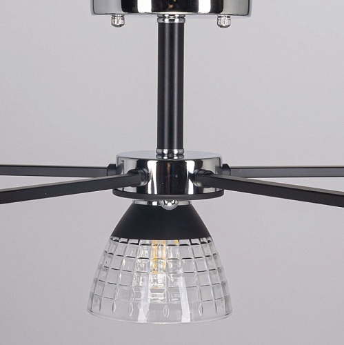 Металлическое основание потолочной люстры гальванизировано в цвет хрома. Отдельные элементы основания окрашены в черный цвет. Потолочная люстра декорирована плафонами из фактурного стекла. У основания стеклянные плафоны окрашены в черный цвет.