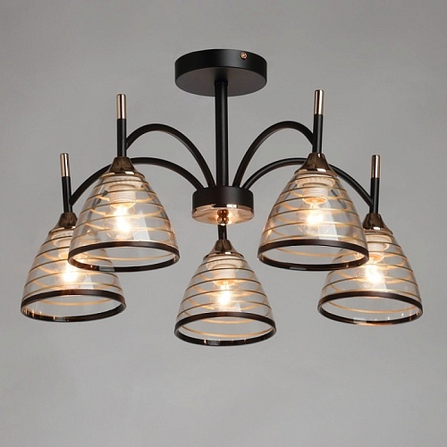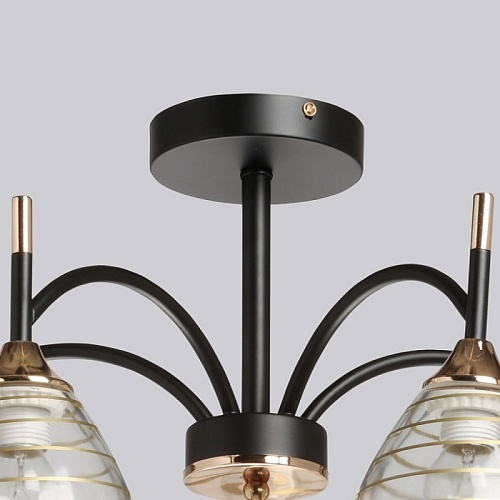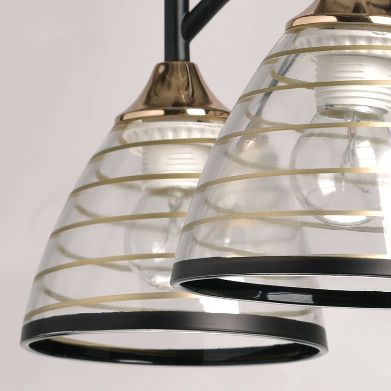 Металлическое основание потолочной люстры окрашено в черный цвет. Отдельные элементы основания гальванизированы в цвет золота. На прозрачные стеклянные плафоны нанесены тонкие полоски цвета золота. Нижний край плафонов отделан кантом черного цвета.