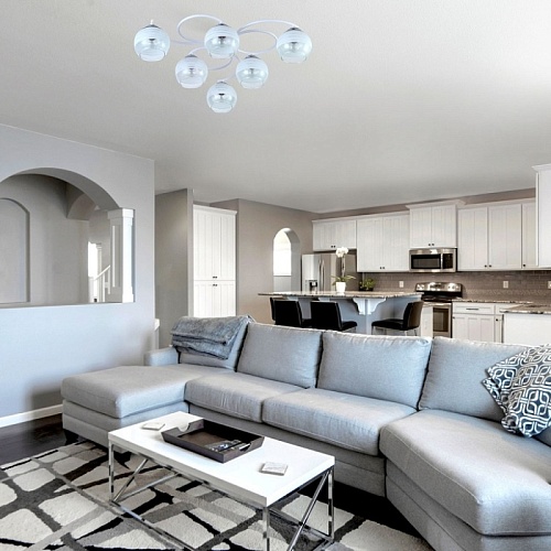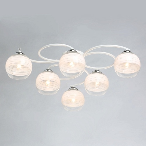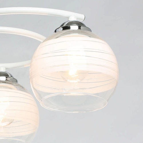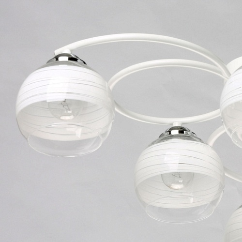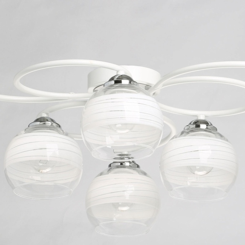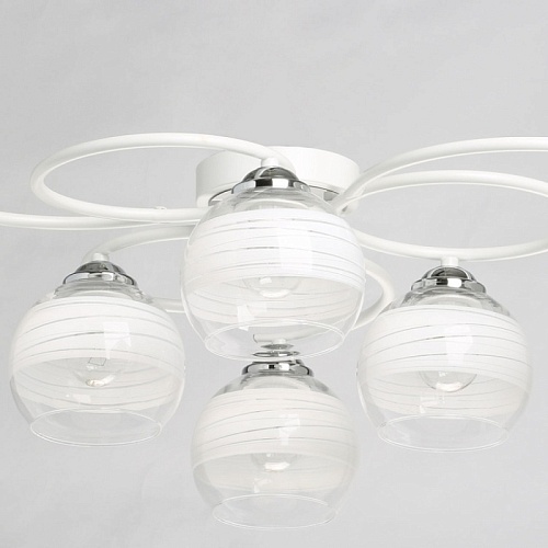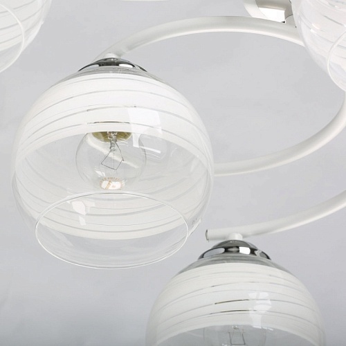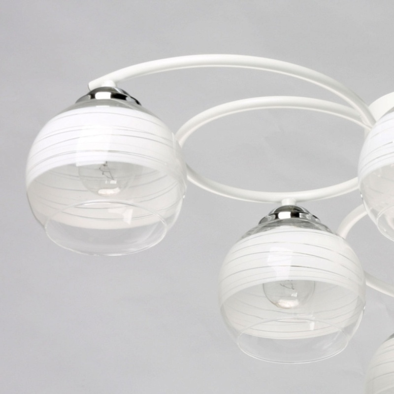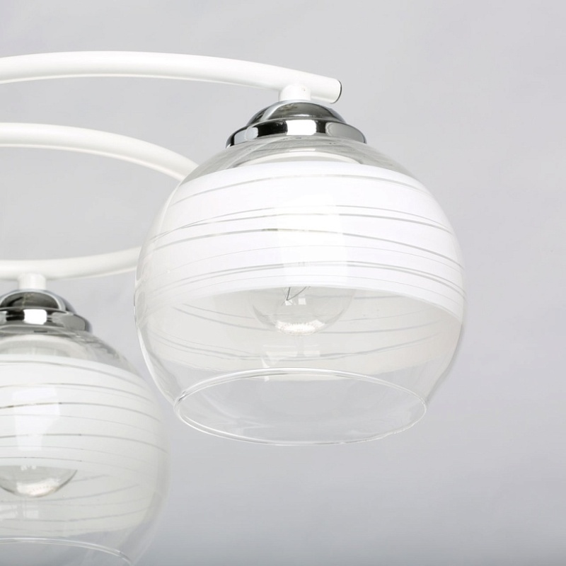 Металлическое основание потолочного светильника гальванизировано в цвет хрома. Отдельные элементы окрашены в белый цвет. Светильник декорирован выдувными вручную стеклянными плафонами. На плафоны нанесен рисунок в виде параллельных полос белого цвета.