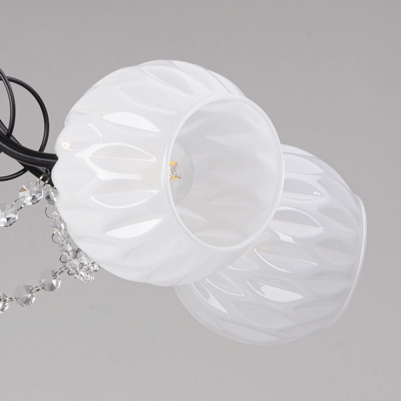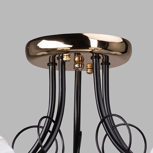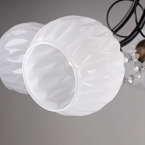 Металлическое основание потолочной люстры гальванизировано в цвет золота. Рожки окрашены в черный цвет. Белые стеклянные плафоны выдуваются в сложную форму. Потолочная люстра декорирована прозрачным хрусталем формы октагон.