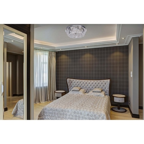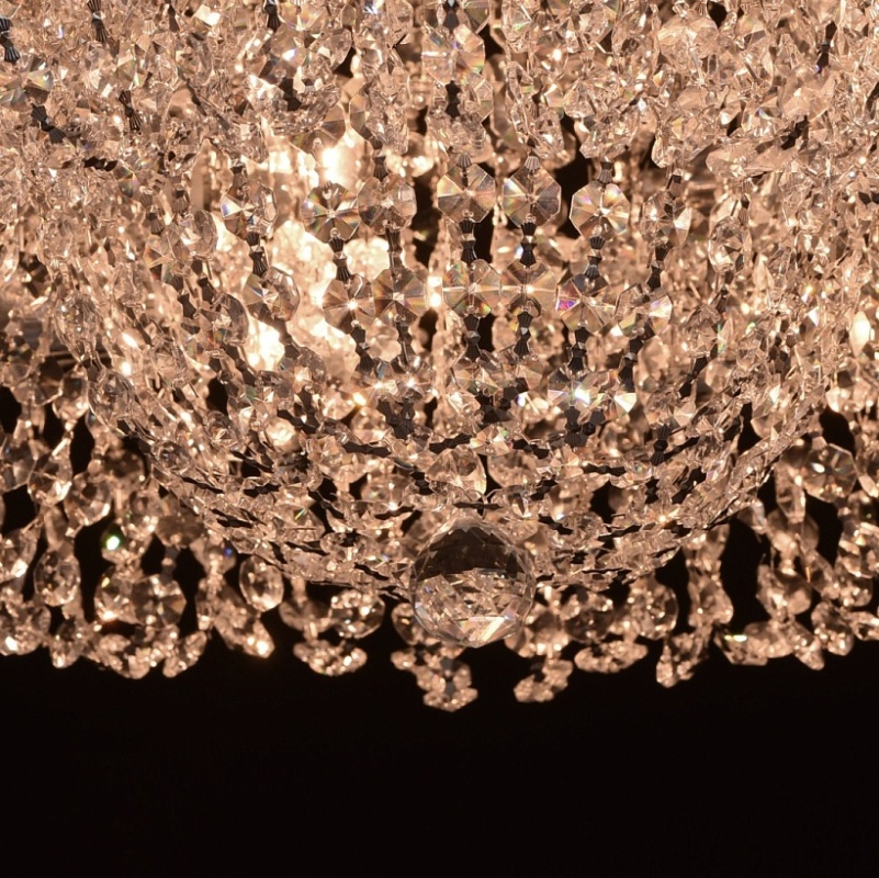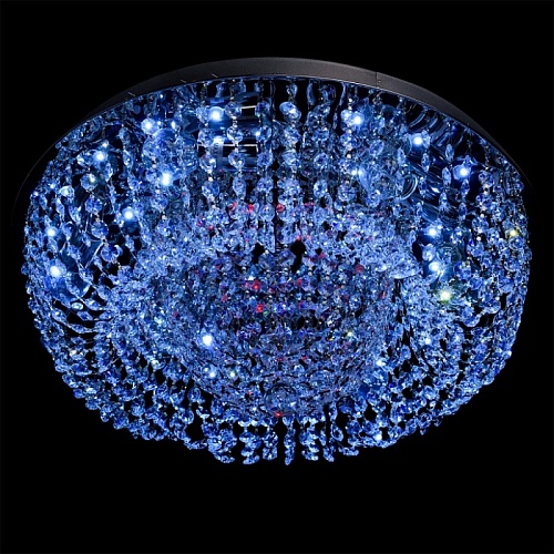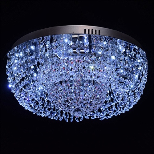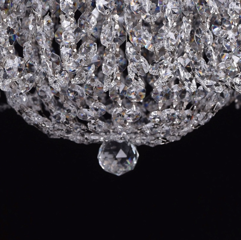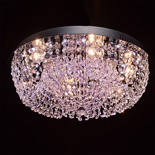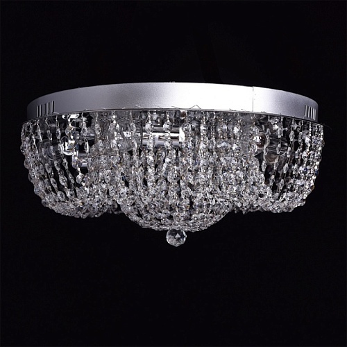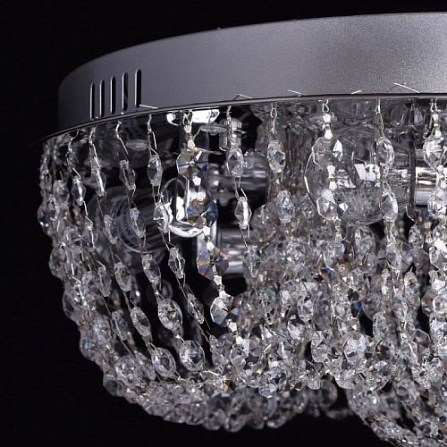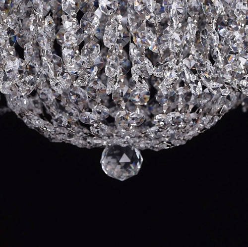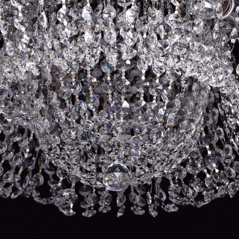 Металлическое основание светильника окрашено в цвет серебра и закрыто пластиной из нержавеющей стали, отполированной до зеркального блеска. Металлические надпатронники гальванизированы в цвет хрома.Светильник декорирован подвесками из хрустального стекла сложной огранки в форме октагонов, центральный подвес в форме шара.