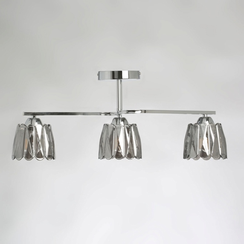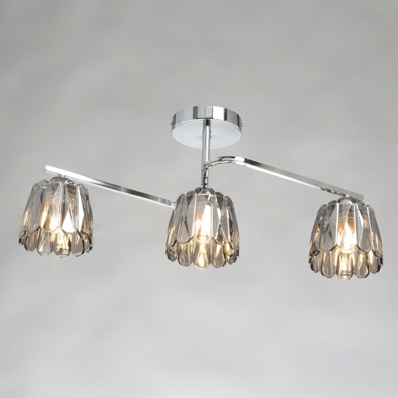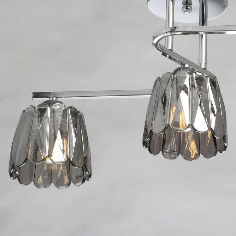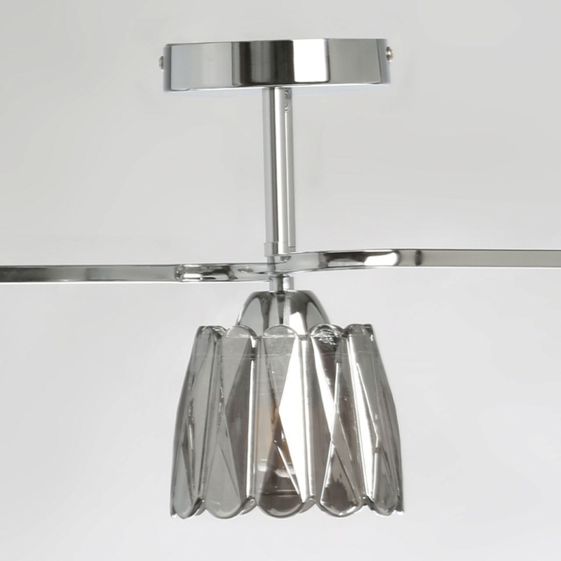Металлическое основание потолочного светильника гальванизировано в цвет хрома. Стеклянные плафоны отлиты в сложную фактурную форму и гальванизированы в дымчатый цвет