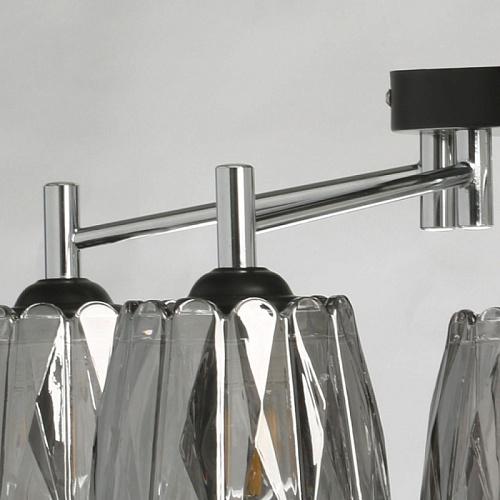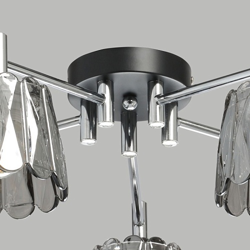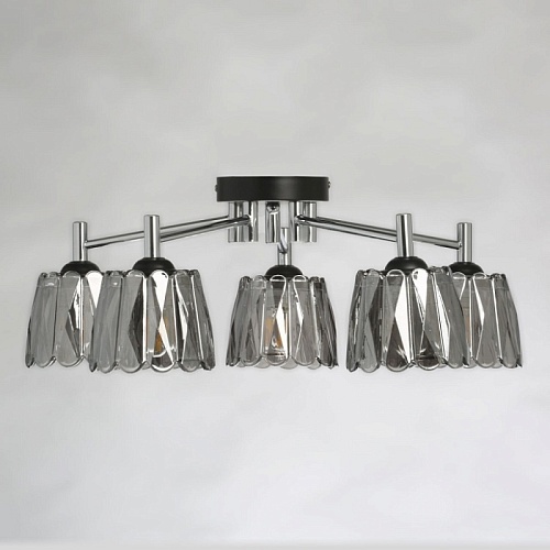 Металлическое основание потолочного светильника гальванизировано в цвет хрома. Потолочная чаша окрашена в черный цвет. Стеклянные плафоны отлиты в сложную фактурную форму и гальванизированы в дымчатый цвет