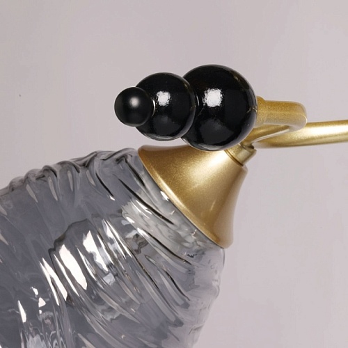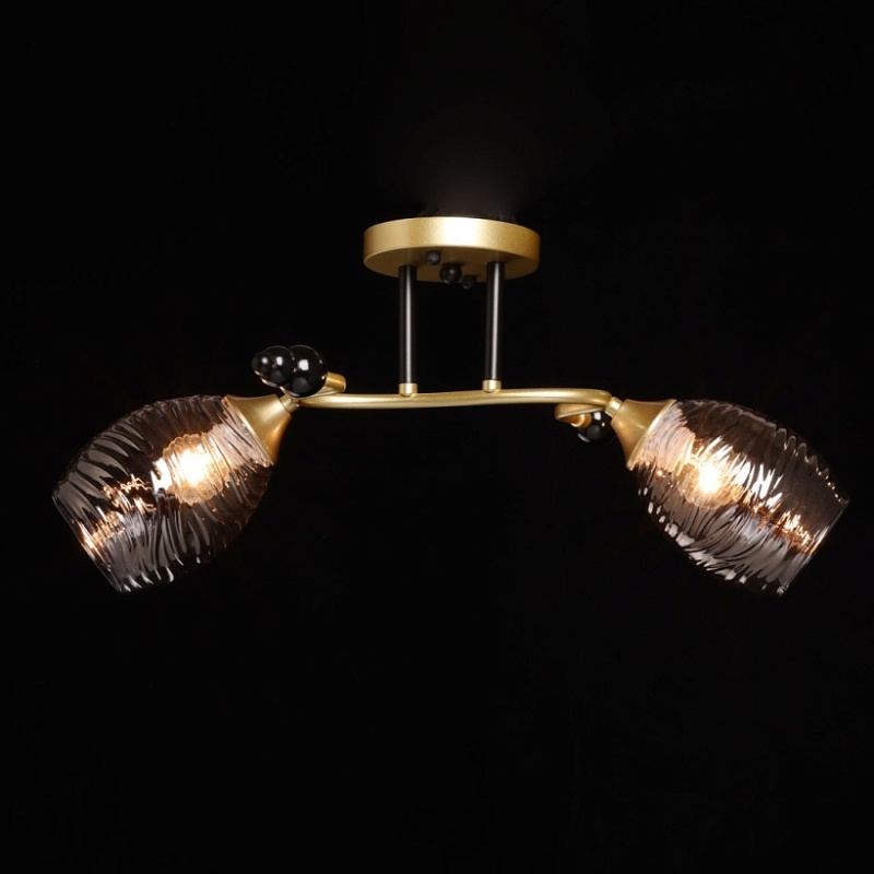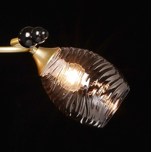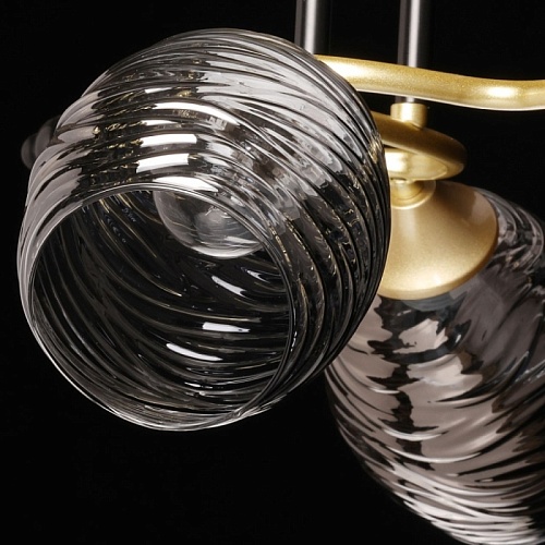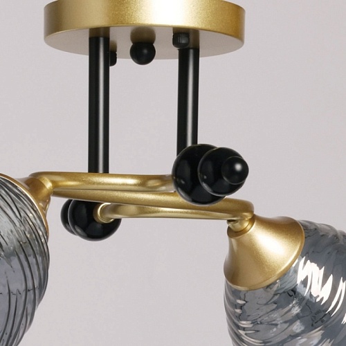 Металлическое основание потолочной люстры окрашено в цвет матового золота. Отдельные элементы основания окрашены в черный цвет. Стеклянные фактурные плафоны выдуваются в сложную форму вручную и гальванизированы в дымчатый цвет.
