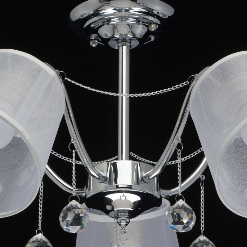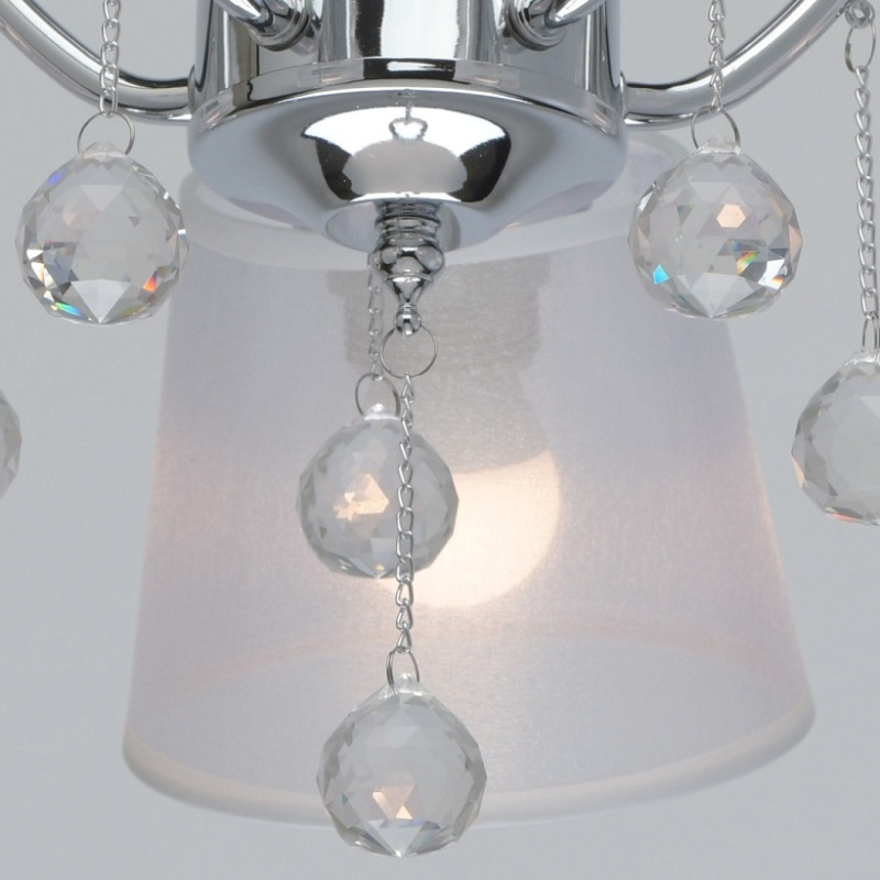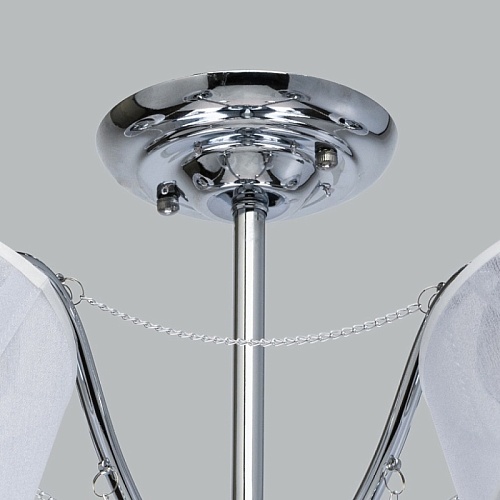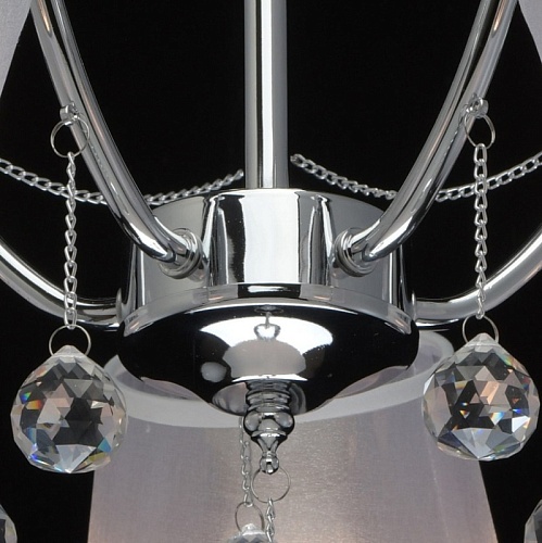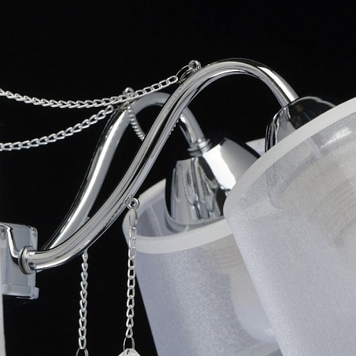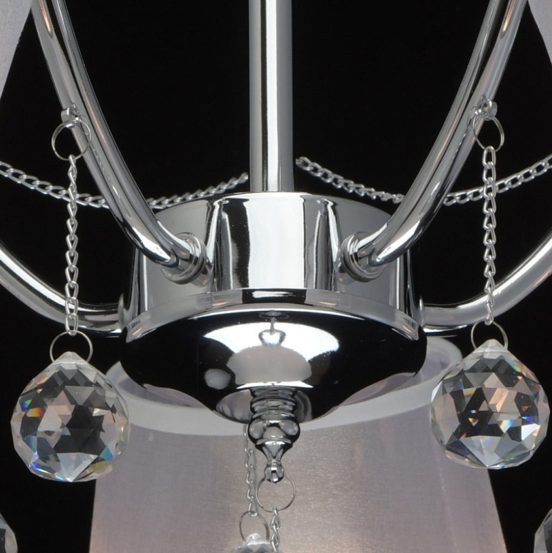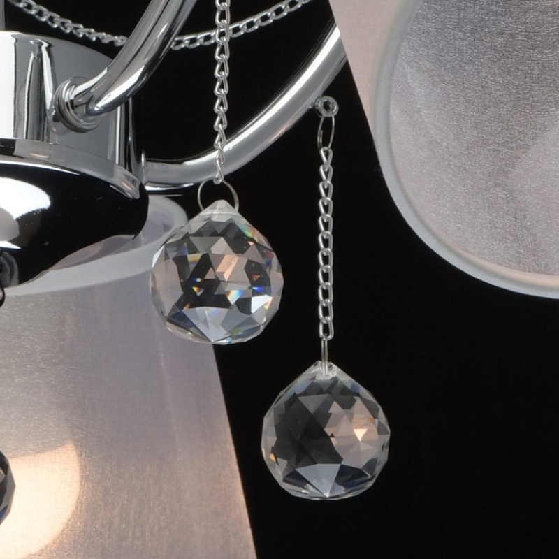 Основание светильника выполнено из сплава металла и гальванизировано в цвет хрома. Абажуры из прозрачной органзы белого цвета с термостойким акрилом внутри. Абажуры отделаны кантом сверху и снизу, прошиты. Светильник декорирован металлическими цепочками в цвет основания и прозрачным хрусталем в форме шара.