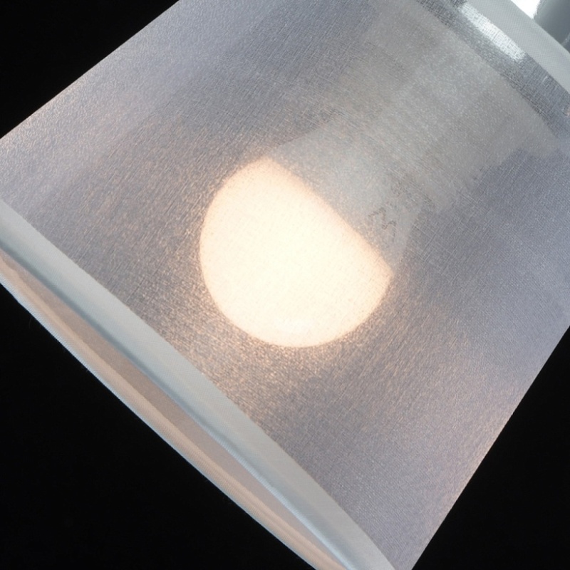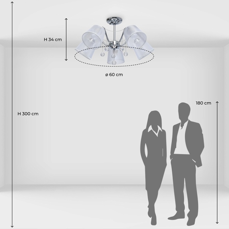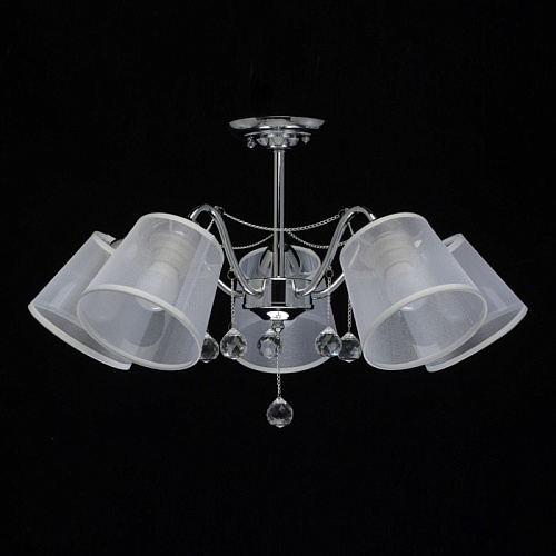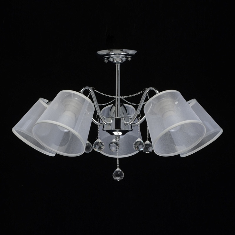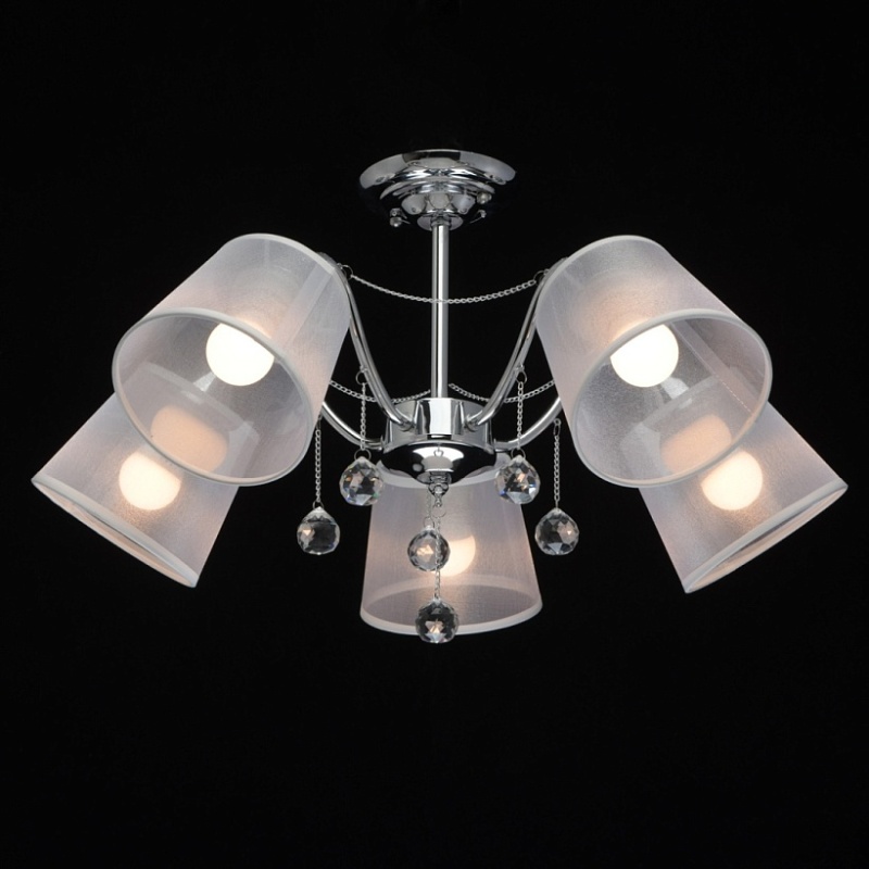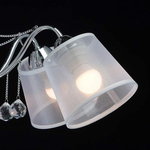 Основание светильника выполнено из сплава металла и гальванизировано в цвет хрома. Абажуры из прозрачной органзы белого цвета с термостойким акрилом внутри. Абажуры отделаны кантом сверху и снизу, прошиты. Светильник декорирован металлическими цепочками в цвет основания и прозрачным хрусталем в форме шара.