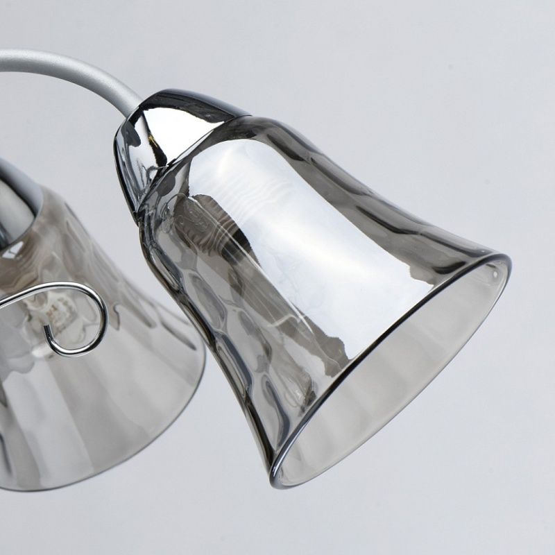 Металлическое основание светильника обработано по технологии порошкового окрашивания в серебряный цвет. Отдельные элементы основания гальванизированы в цвет хрома. Рельефные стеклянные плафоны отлиты в сложную форму и гальванизированы в дымчатый цвет.