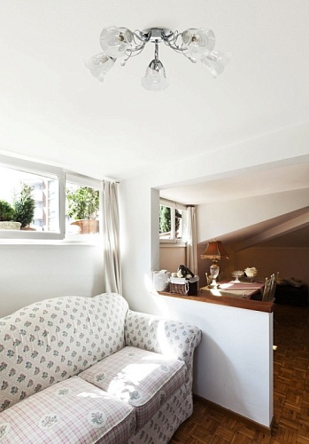 Металлическое основание гальванизировано в цвет хрома. Стеклянные плафоны отлиты в сложную форму и матированы. Светильник декорирован хрустальным стеклом миндалевидной формы.