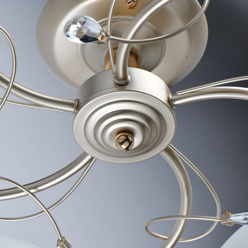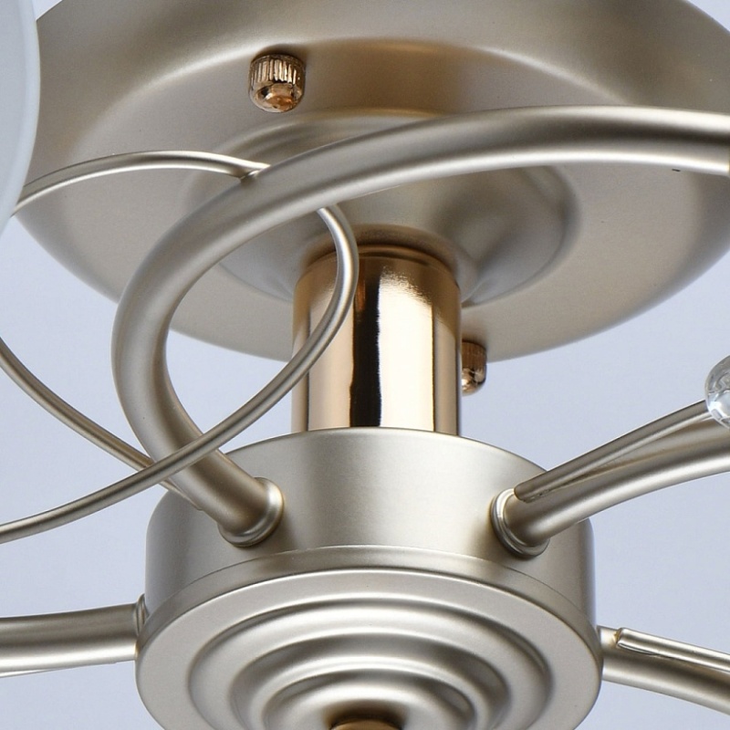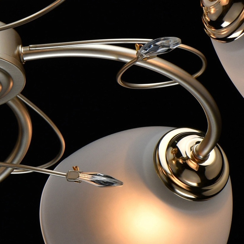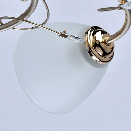 Основание светильника выполнено из металла и окрашено в цвет перламутрового золота. Отдельные элементы основания гальванизированы в цвет золота. Светильник декорирован стеклянными матовыми плафонами.