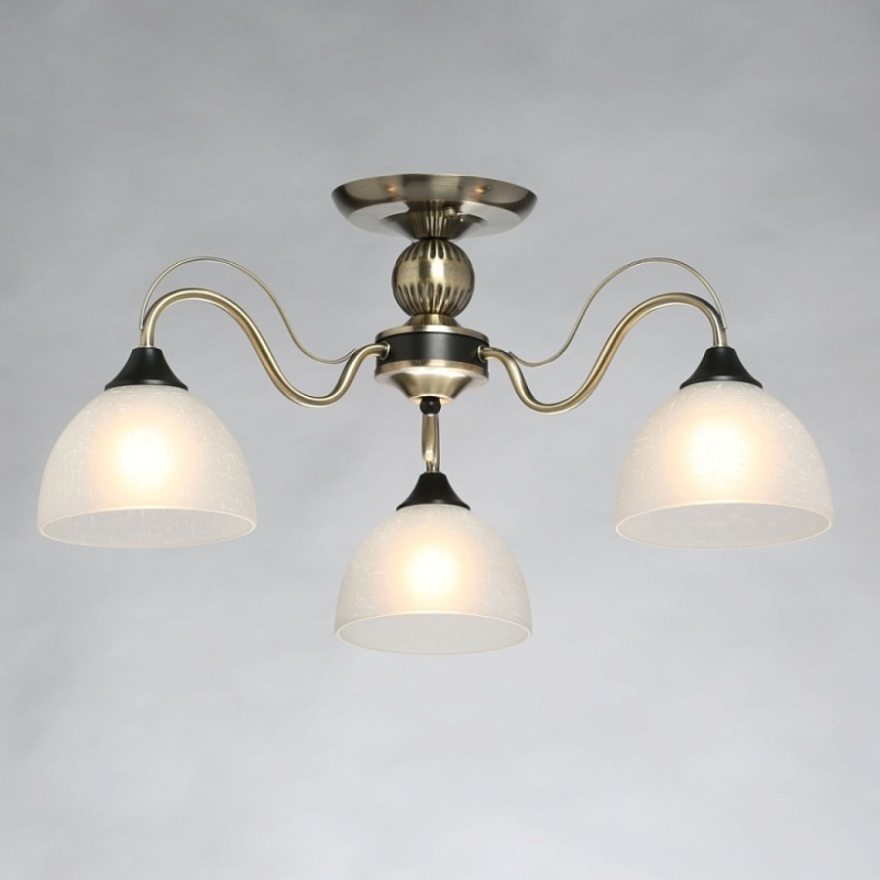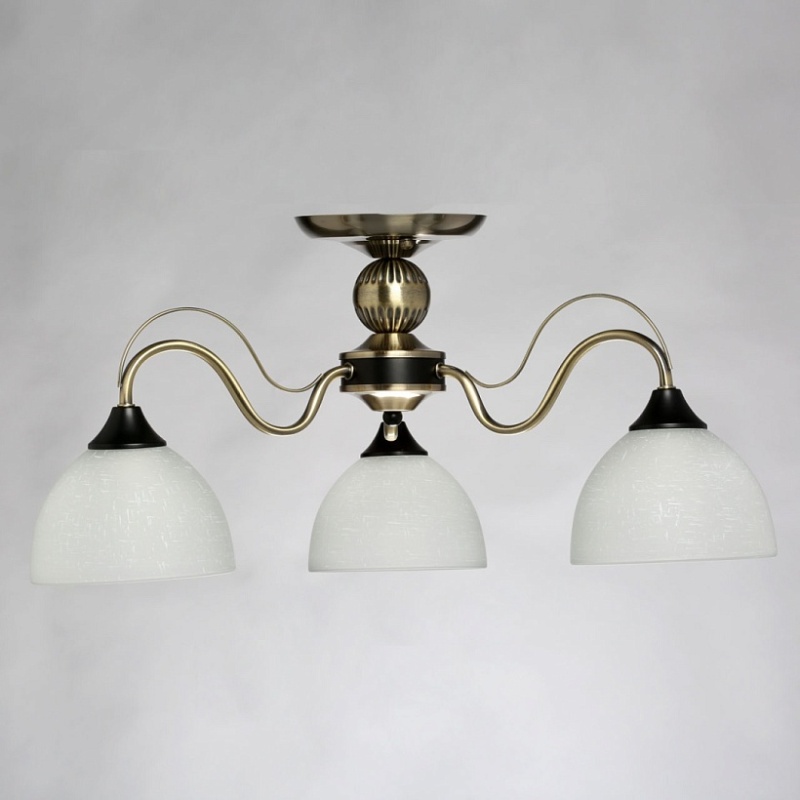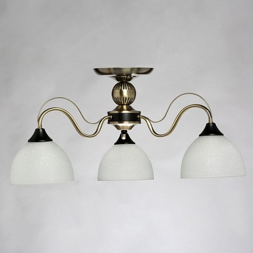 Металлическое основание гальванизировано в цвет античной бронзы. Отдельные элементы основания окрашены в черный цвет. Светильник декорирован стеклянными плафонами, отлитыми в форму. Плафоны матированы и окрашены вручную. На плафоны белым цветом нанесен рисунок в виде паутинки.