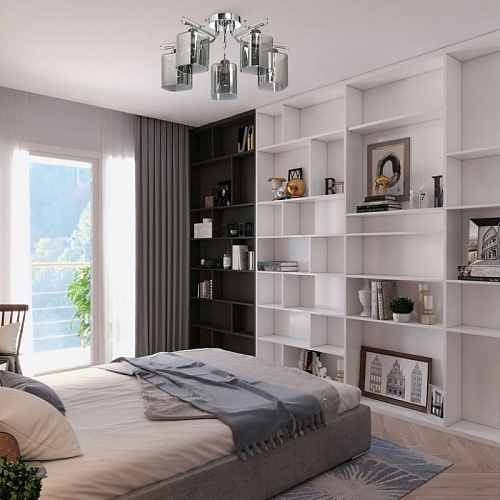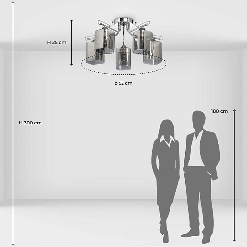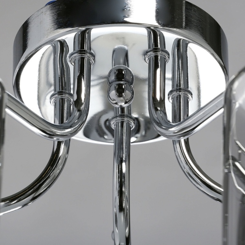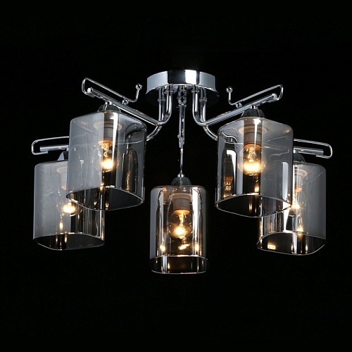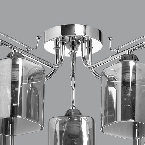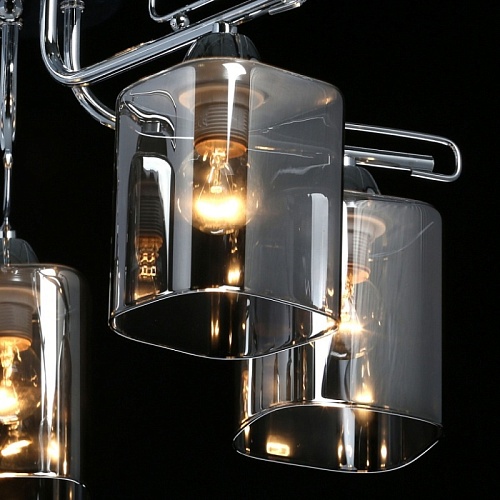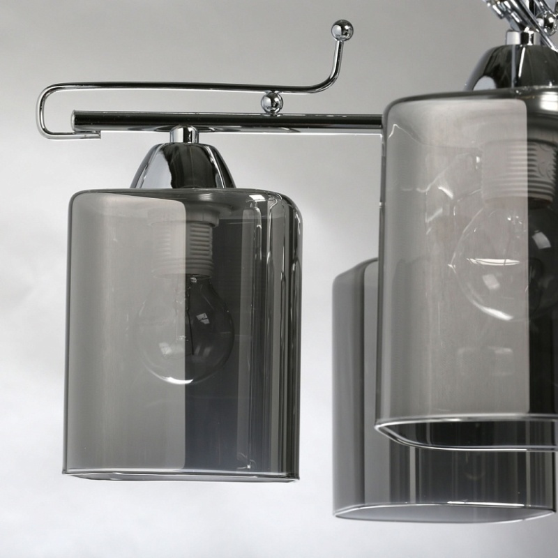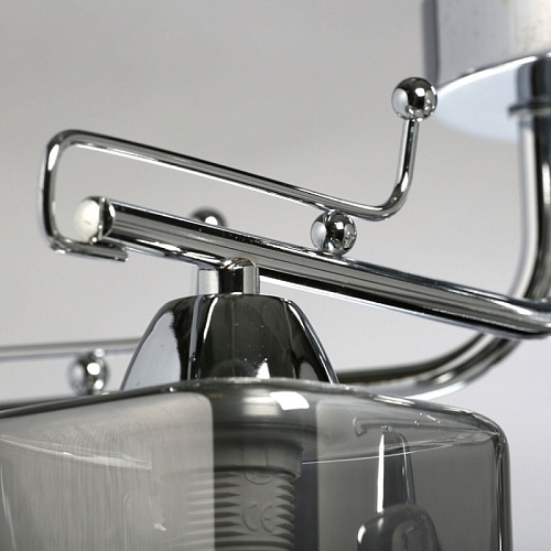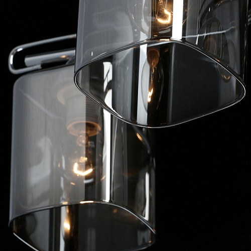 Основание светильника выполнено из металла и гальванизировано в цвет хрома. Стеклянные плафоны гальванизированы в дымчатый цвет.