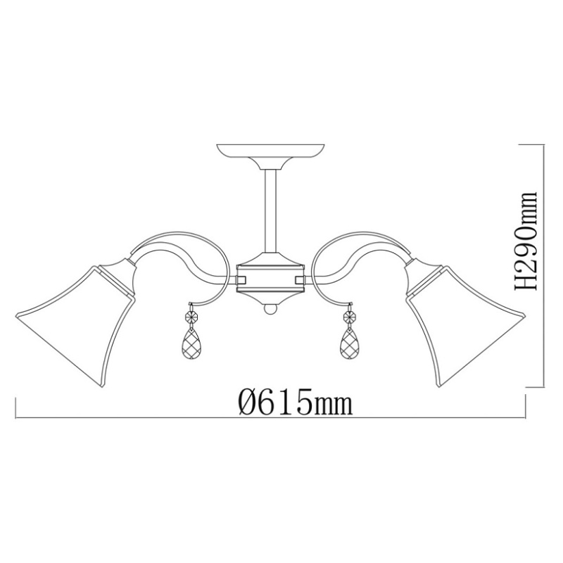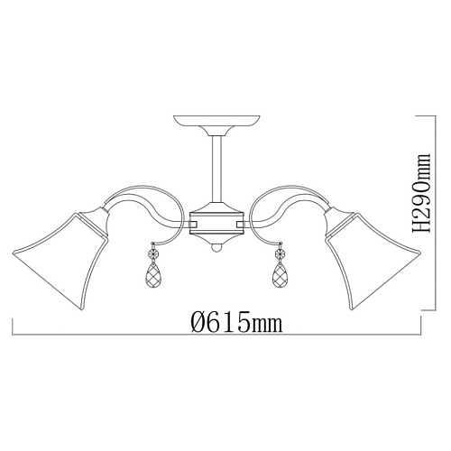 Основание светильника выполнено из металла. Потолочная чаша и держатели плафонов окрашены в черный цвет, рожки гальванизированы в цвет хрома. Стеклянные плафоны матированы по трафарету. Также, на плафоны нанесен геометрический рисунок черного цвета.