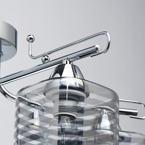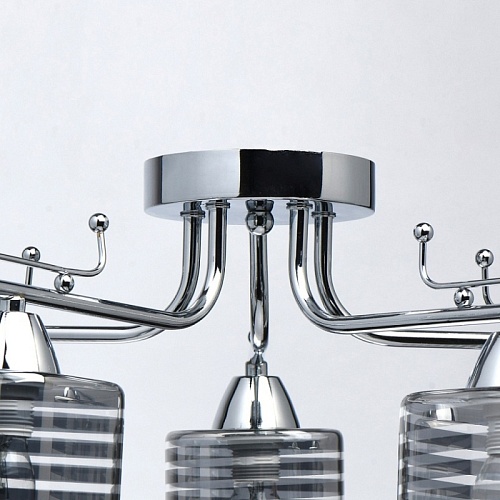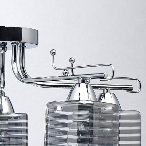 Металлическое основание гальванизировано в цвет хрома. Стеклянные плафоны гальванизированы в дымчатый цвет по трафарету в полоску.