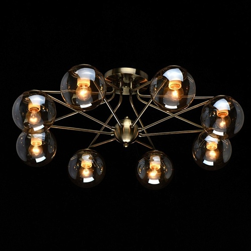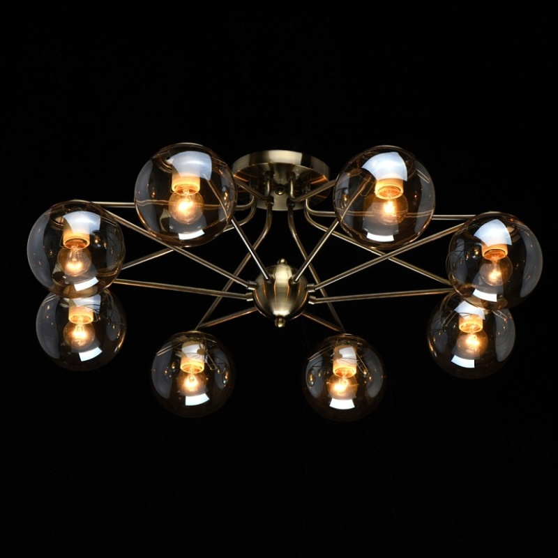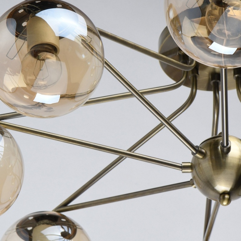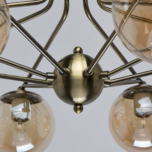 Основание светильника выполнено из металла и гальванизировано в цвет античной бронзы. Светильник декорирован стеклянными плафонами, гальванизированными в цвет топаз.