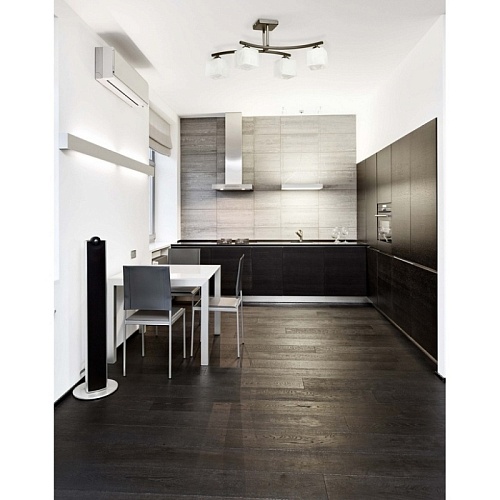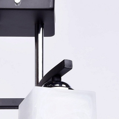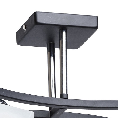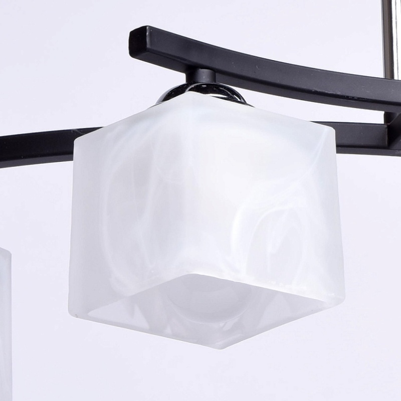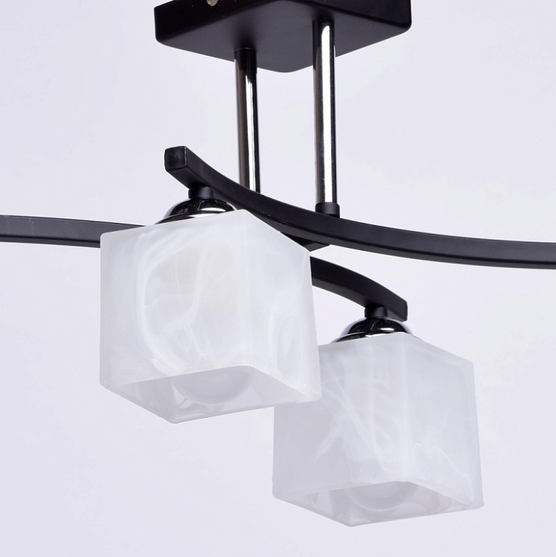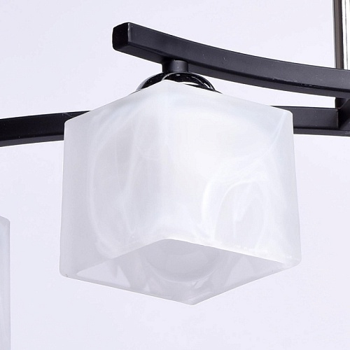 Арматура выполнена из сплава железа и окрашена в черный цвет. Штанги гальванизированы в цвет хрома. Светильник декорирован плафонами из матированного стекла, окрашенного в белый цвет с добавлением алебастра.