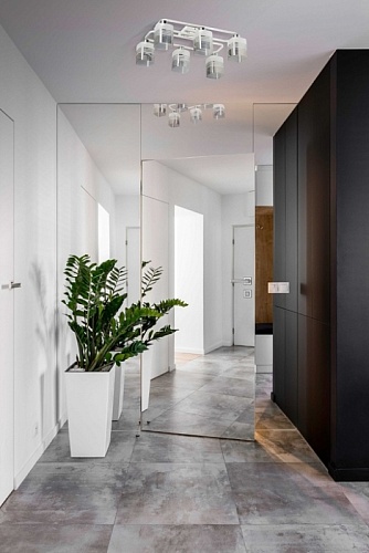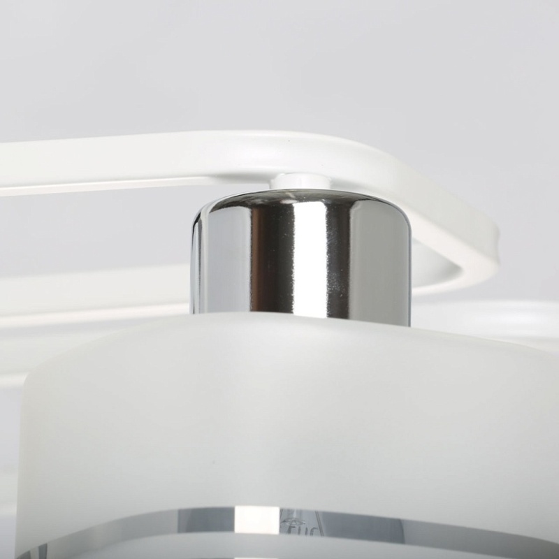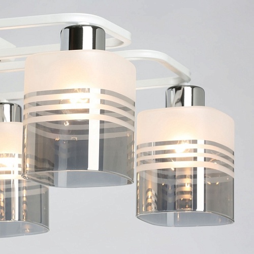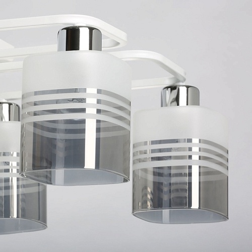 Металлическое основание потолочного светильника окрашено в белый цвет. Отдельные элементы гальванизированы в цвет хрома. Стеклянные плафоны гальванизированы в дымчатый цвет и окрашены в белый цвет в виде параллельных полос