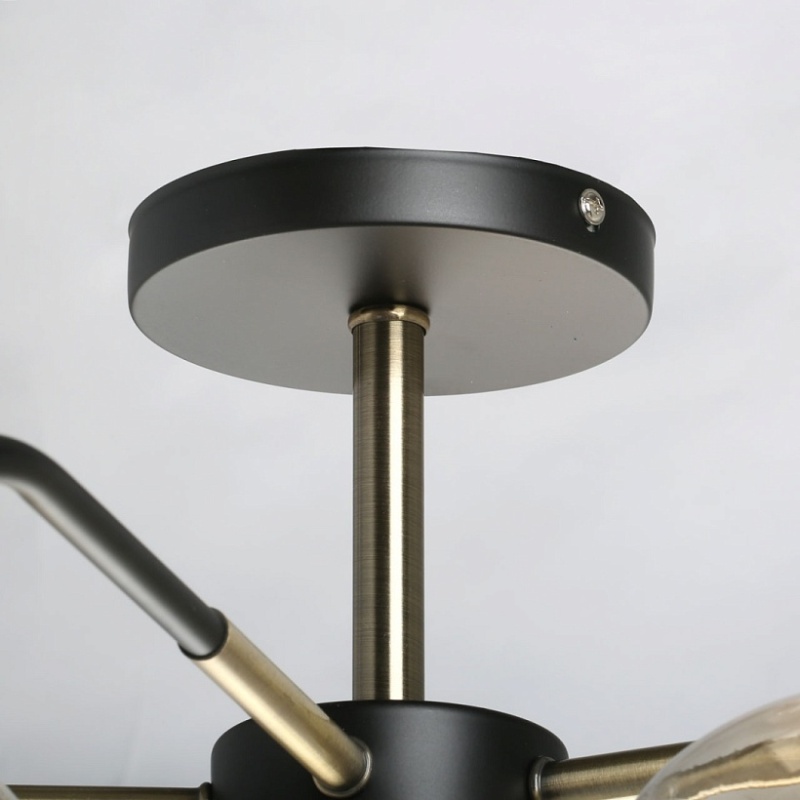 Металлическое основание потолочного светильника окрашено в черный цвет. Отдельные элементы гальванизированы в цвет бронзы. Стеклянные плафоны выдувные в форму гальванизированы в цвет шампань.