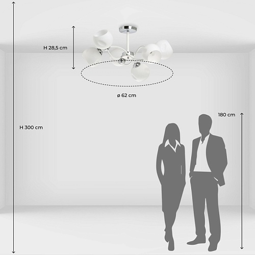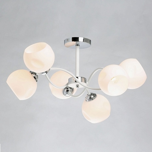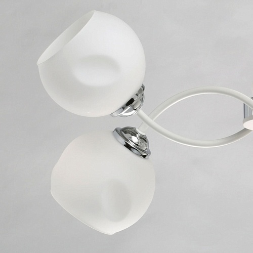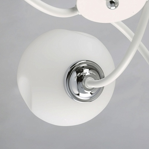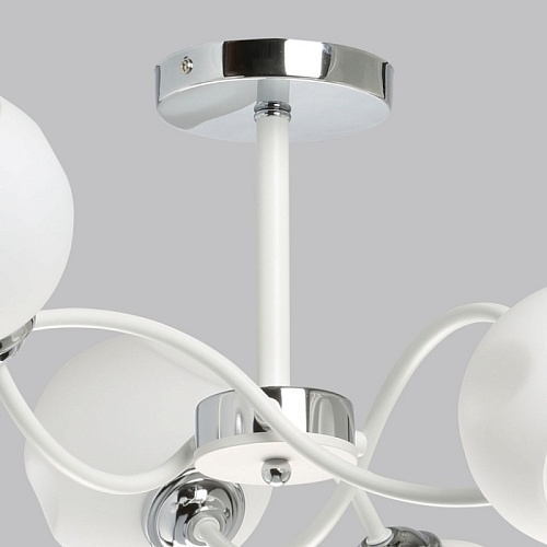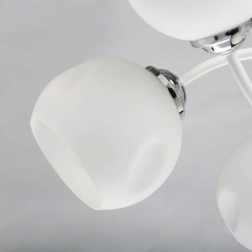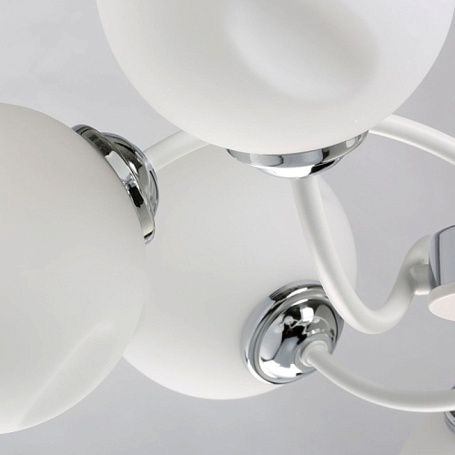 Металлическое основание потолочного светильника окрашено в белый цвет. Отдельные элементы гальванизированы в цвет хрома. Стеклянные плафоны выдуваются в сложную форму и матируются
