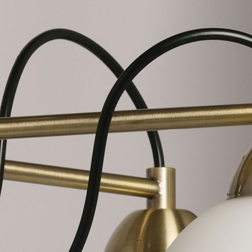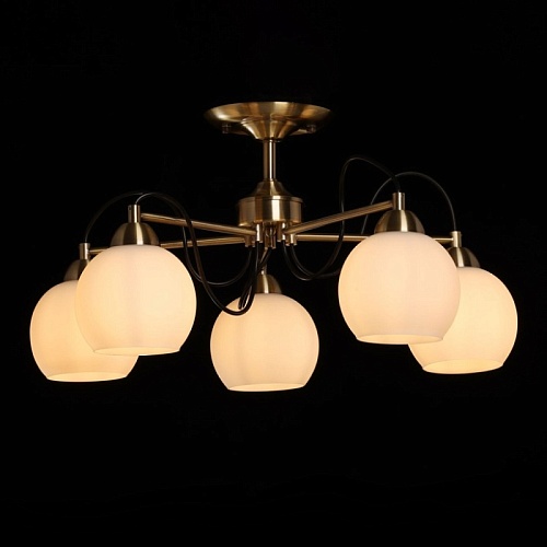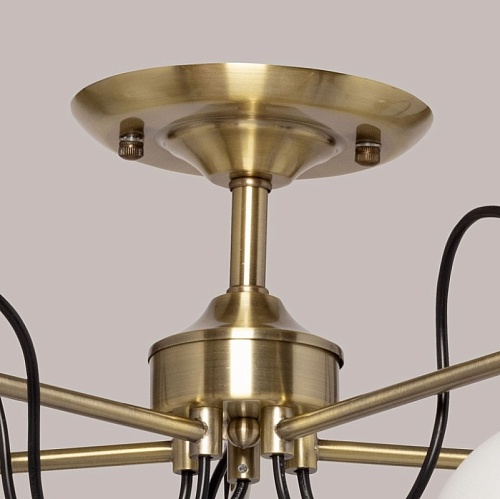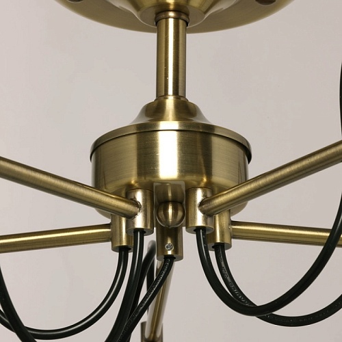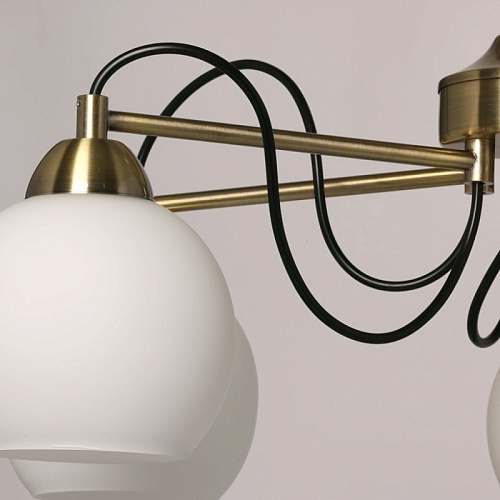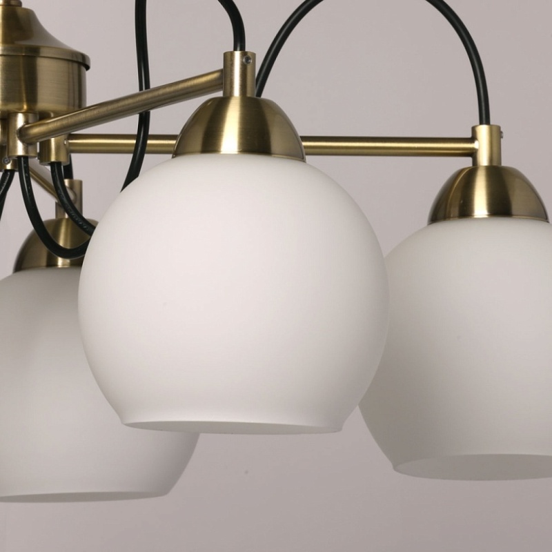 Металлическое основание потолочной люстры гальванизировано в цвет античной бронзы. Светильник декорирован стеклянными плафонами, выдувными в форму вручную и матированными.