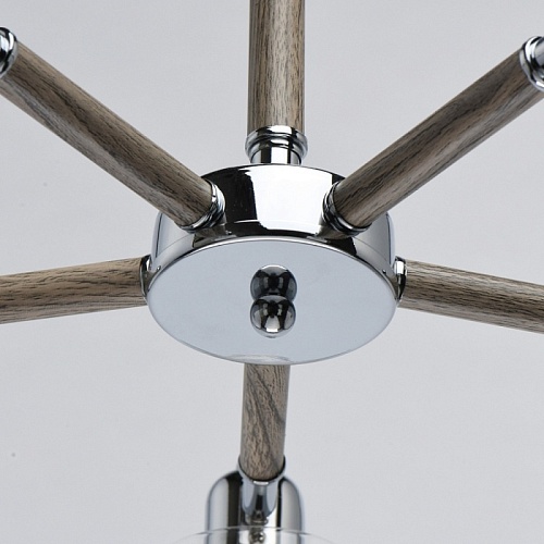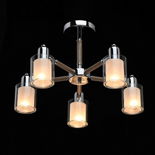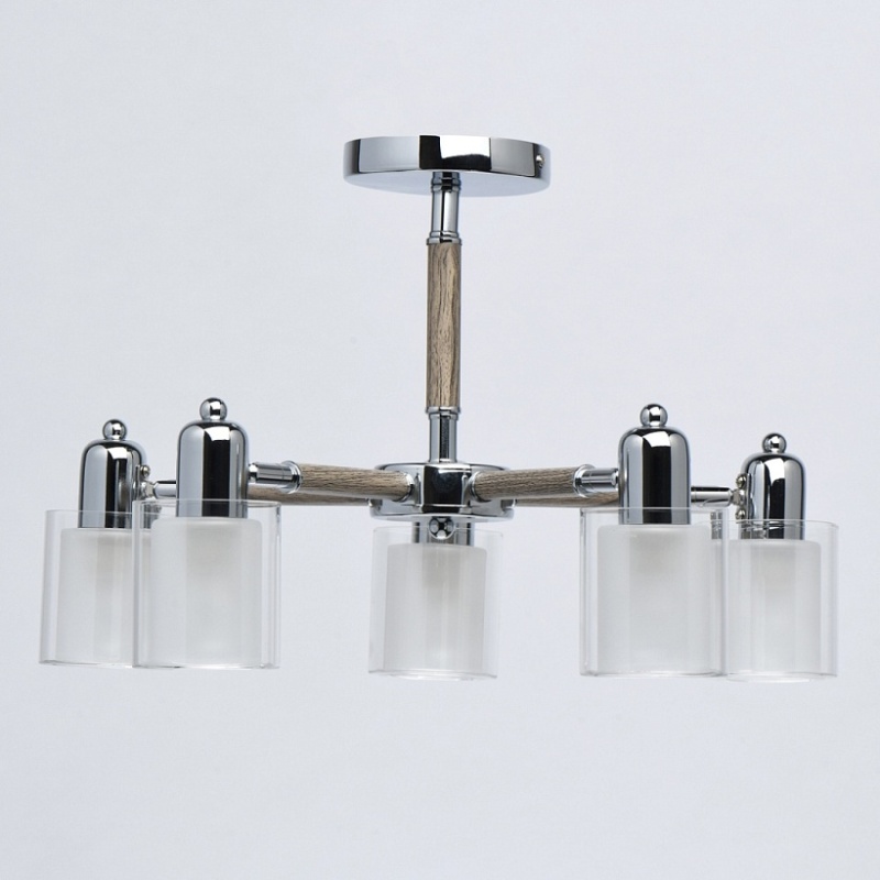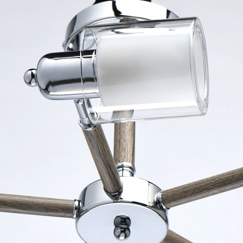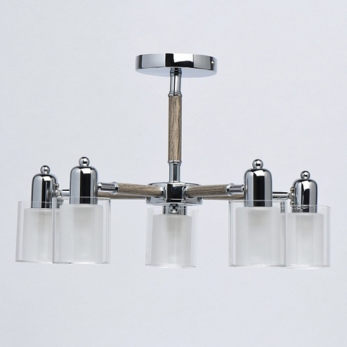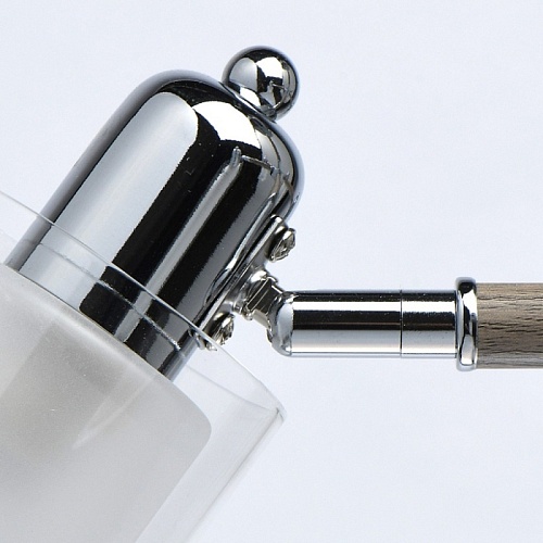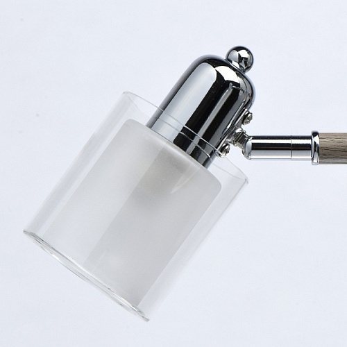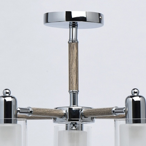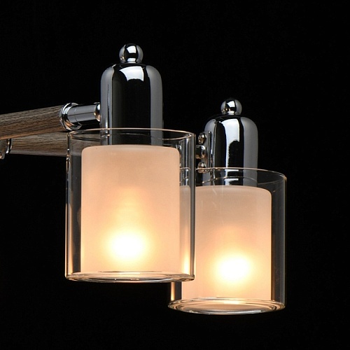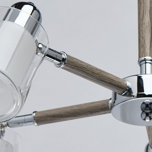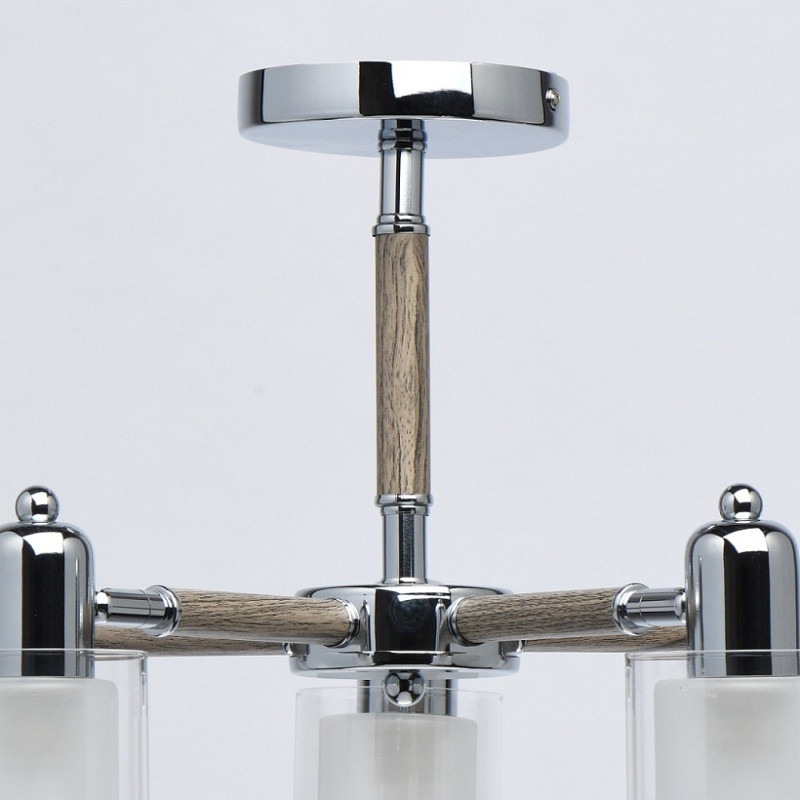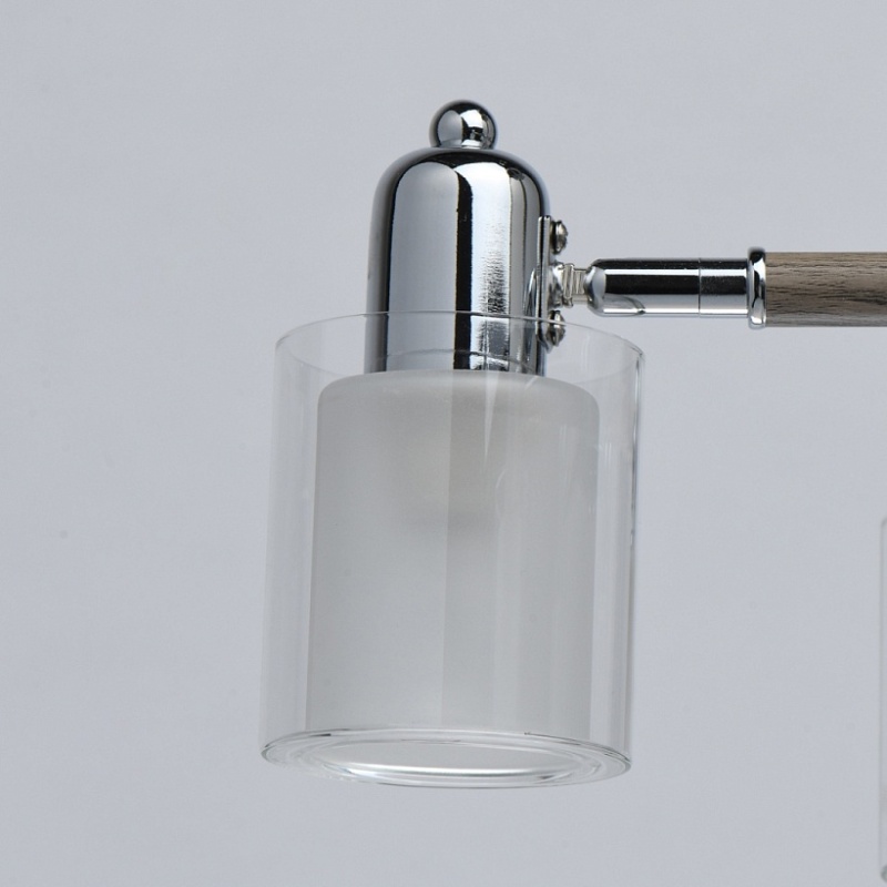 Основание светильника выполнено из металла, гальванизировано в цвет хрома и декорировано имитацией дерева, выполненной по технологии иммерсионной печати. Светильник декорирован двойными стеклянными плафонами. Внутренний плафон матирован, внешний плафон отлит из прозрачного стекла