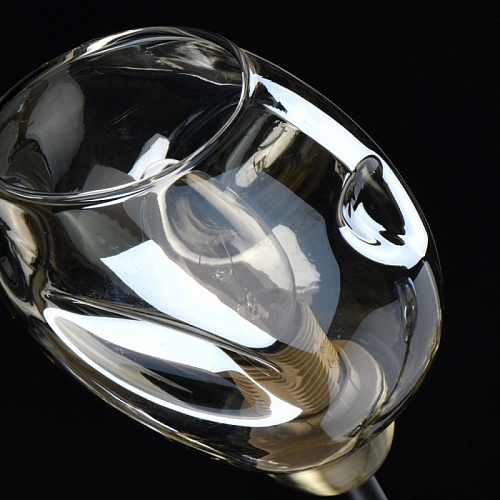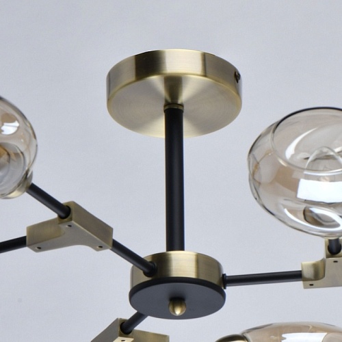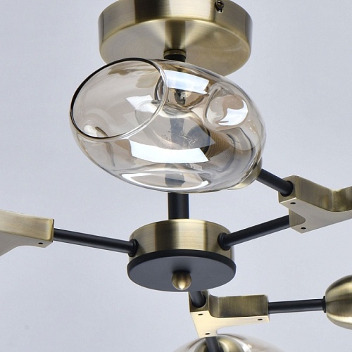 Основание светильника выполнено из металла и окрашено в черный цвет. Отдельные элементы основания гальванизированы в цвет латуни. Стеклянные плафоны отлиты в сложную форму и гальванизированы.