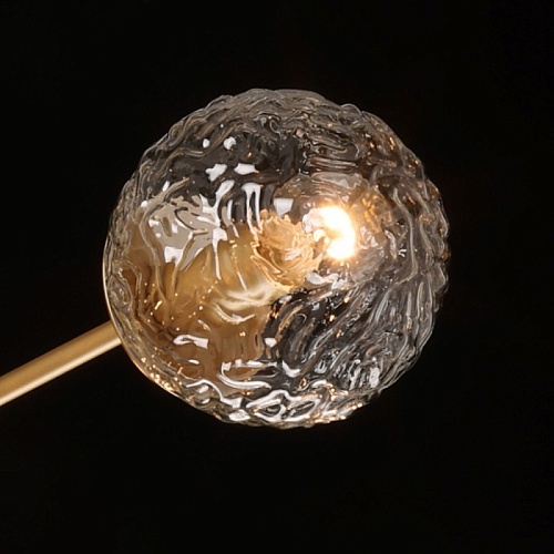 Металлическое основание люстры окрашено в цвет перламутрового золота. Источники света закрыты плафонами из прозрачного фактурного стекла.