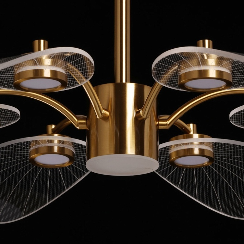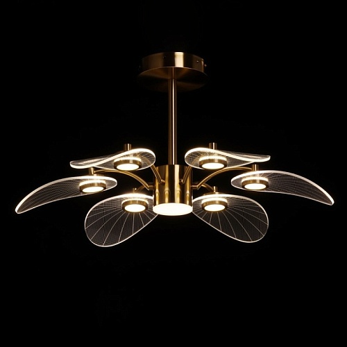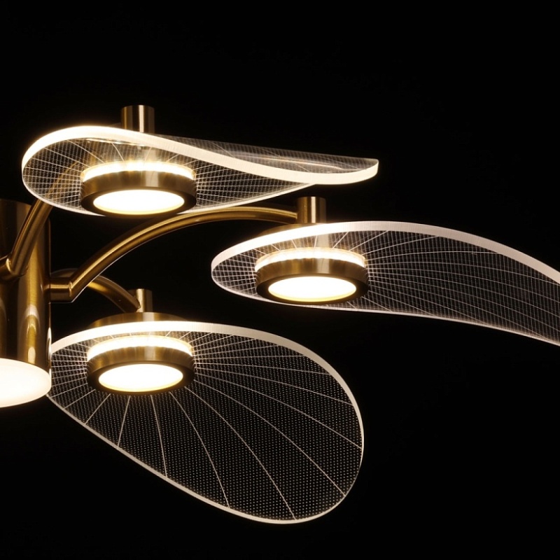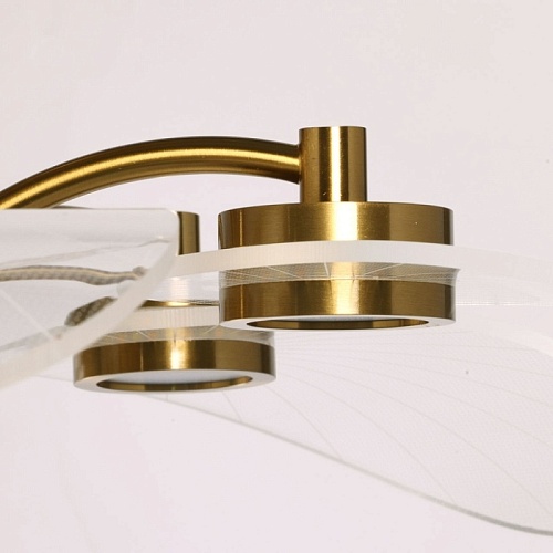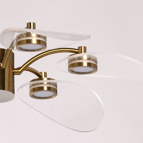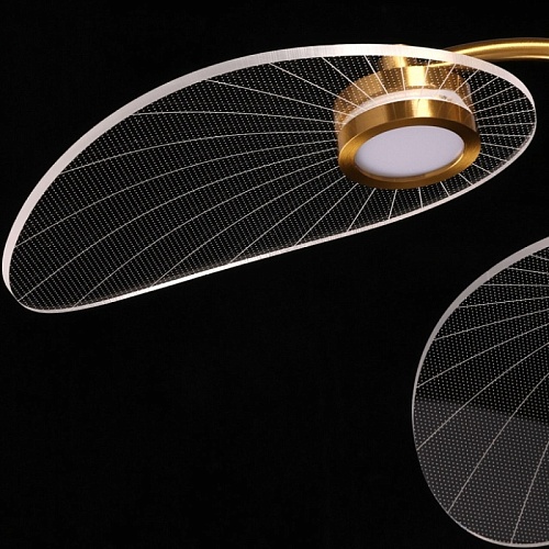 Металлическое основание светильника гальванизировано в цвет латуни. Корпус плафона выполнен из сплава алюминия с цинком. Светодиодные источники света закрыты матовым акрилом. Светильник декорирован пластинами из прозрачного акрила.