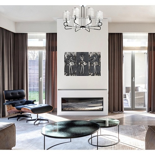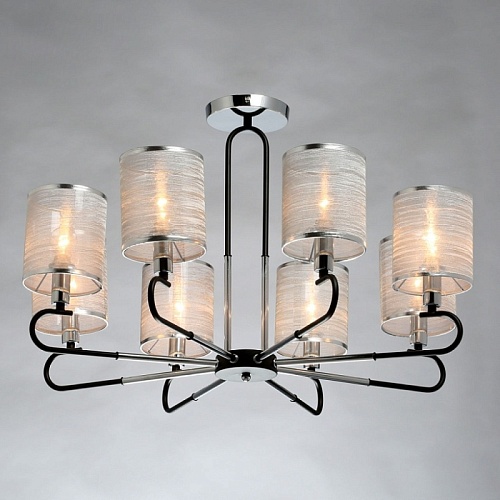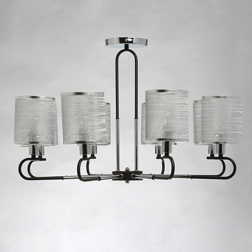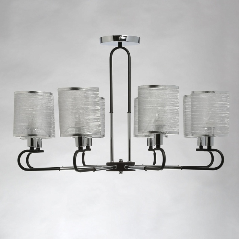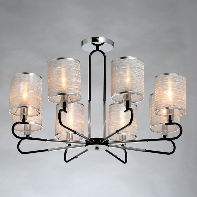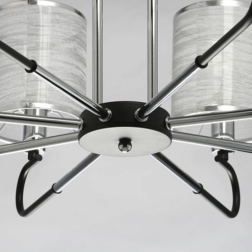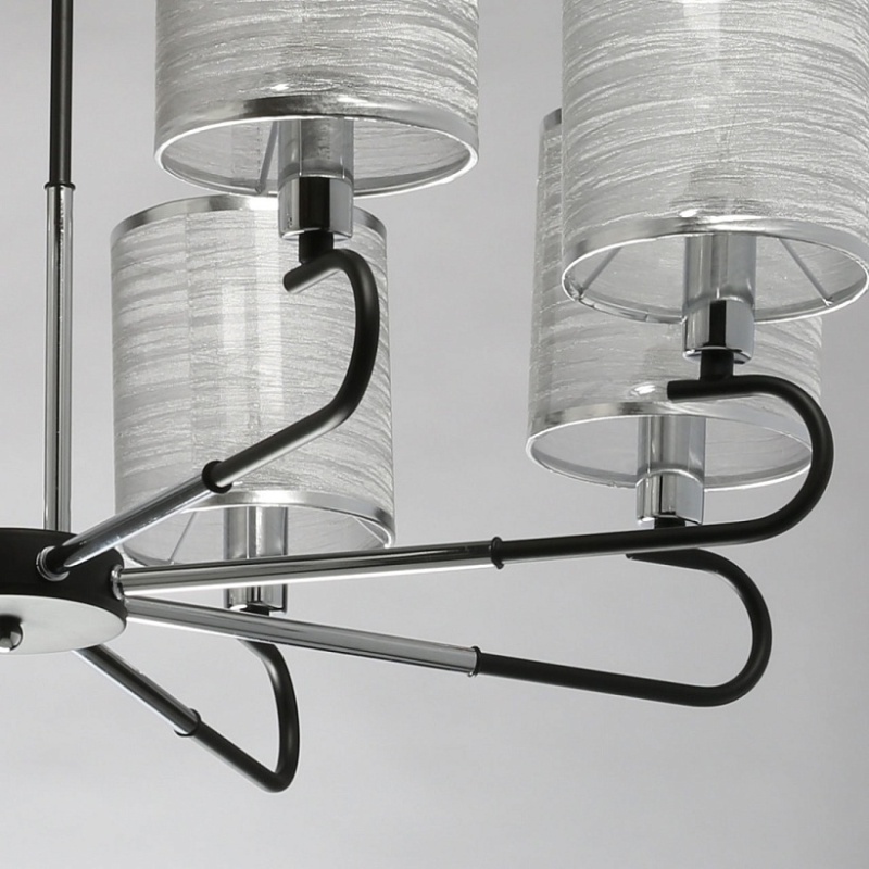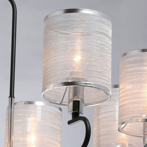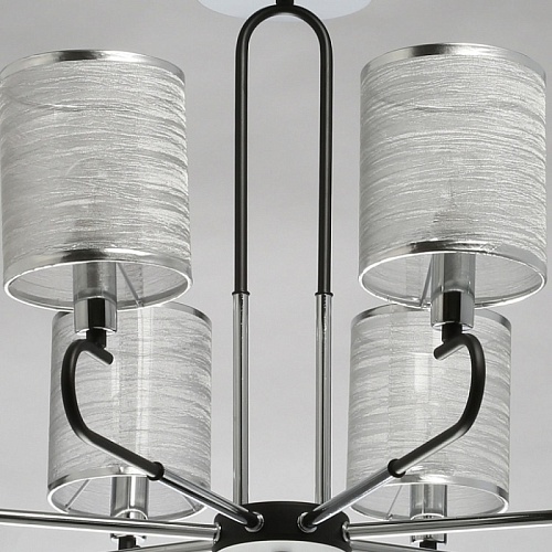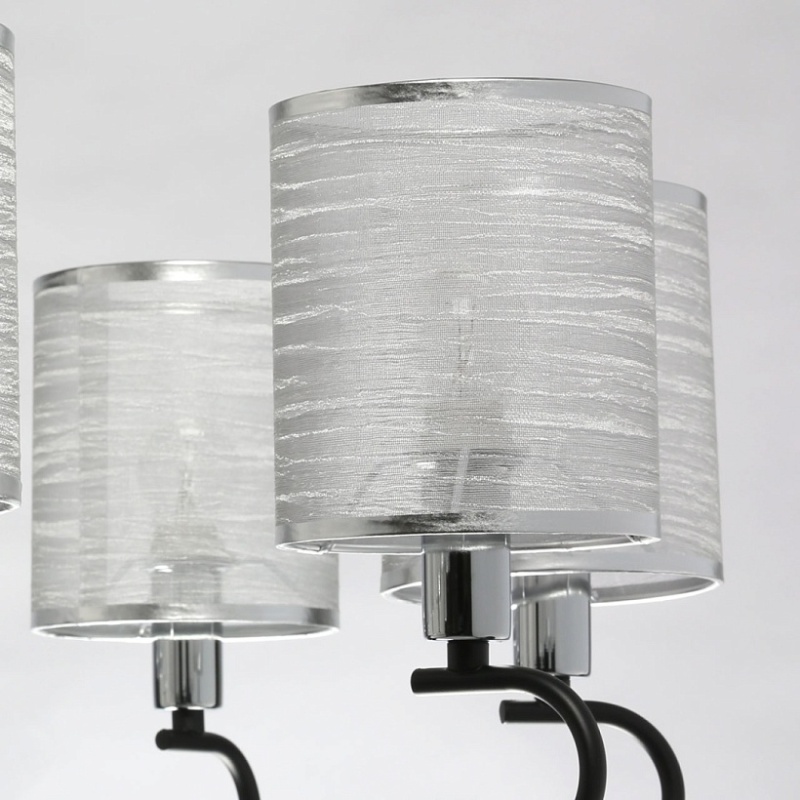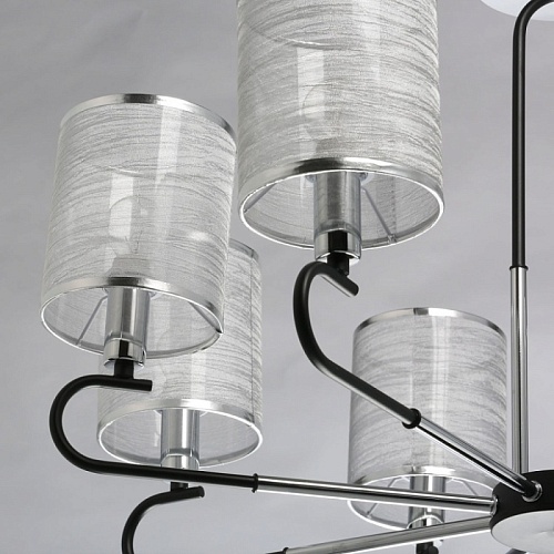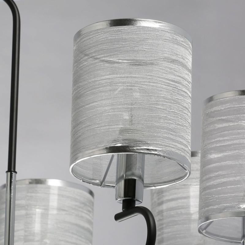 Основание светильника выполнено из металла и гальванизировано в цвет хрома. Отдельные элементы основания окрашены в черный цвет. Светильник декорирован двухслойными текстильными абажурами с термостойким акрилом внутри и жатой органзой серебряного цвета снаружи. Абажуры отделаны кантом серебряного цвета и прошиты.