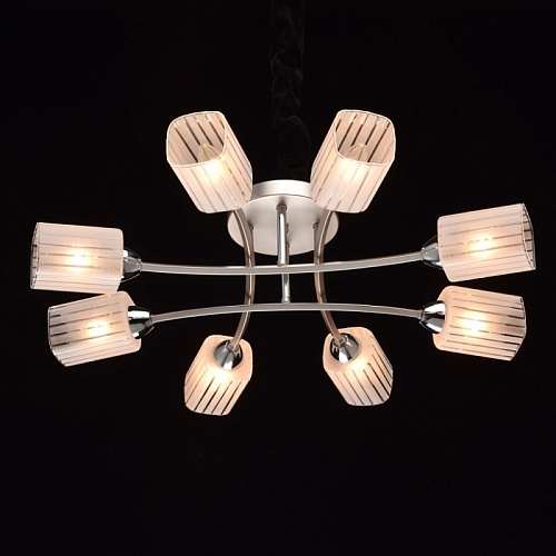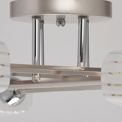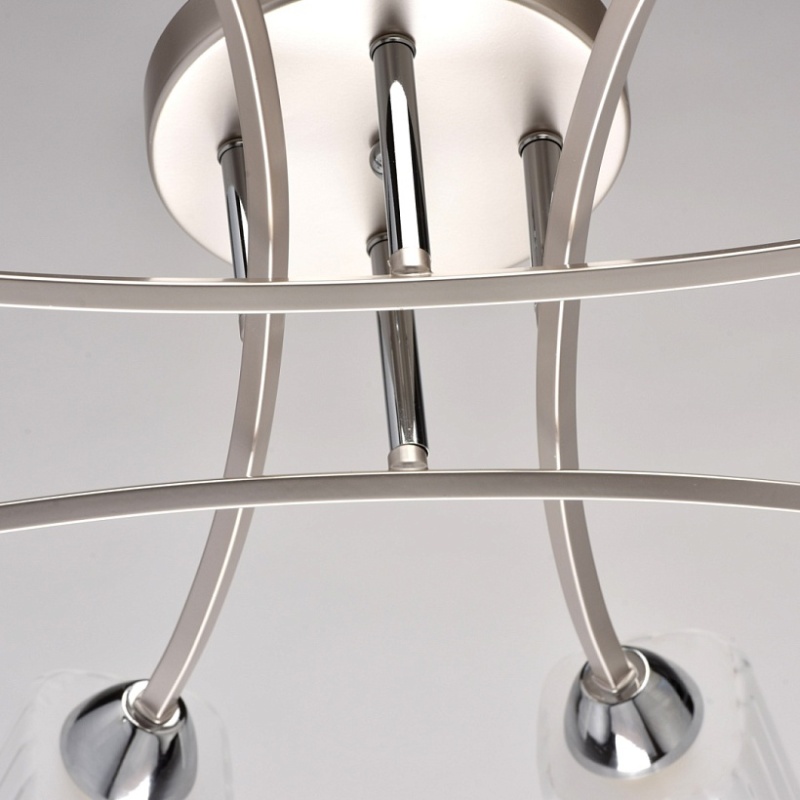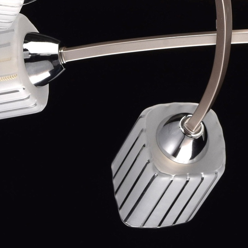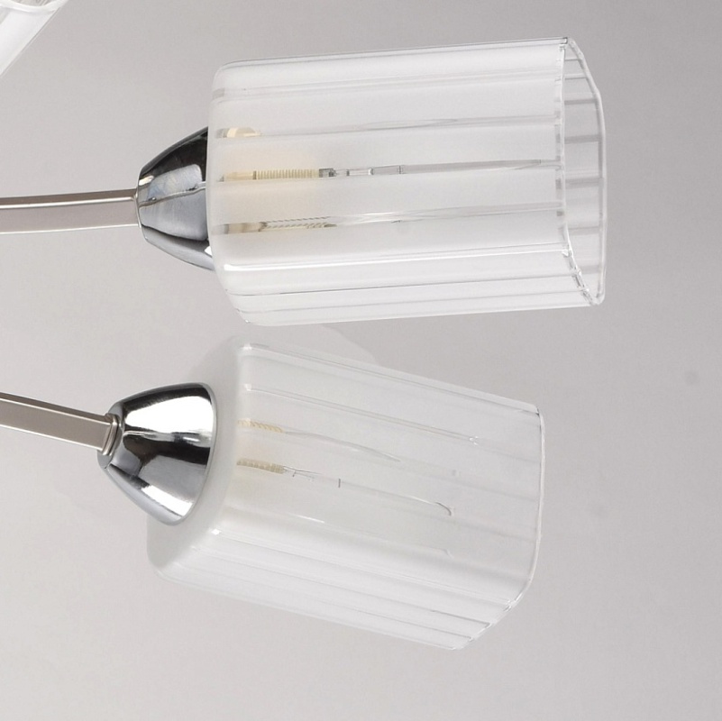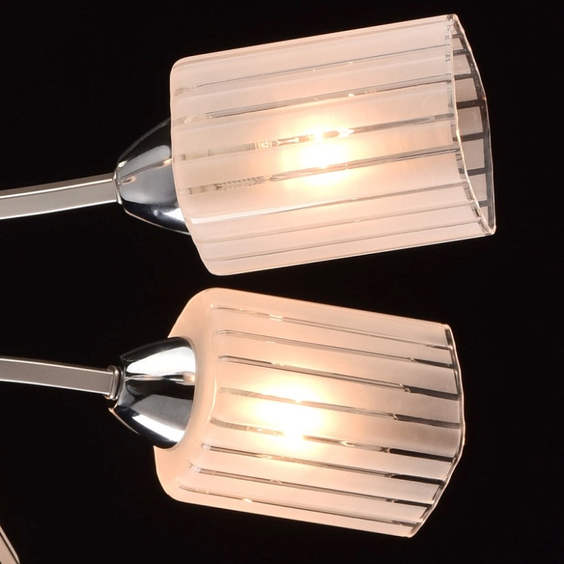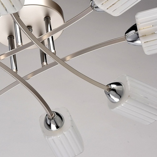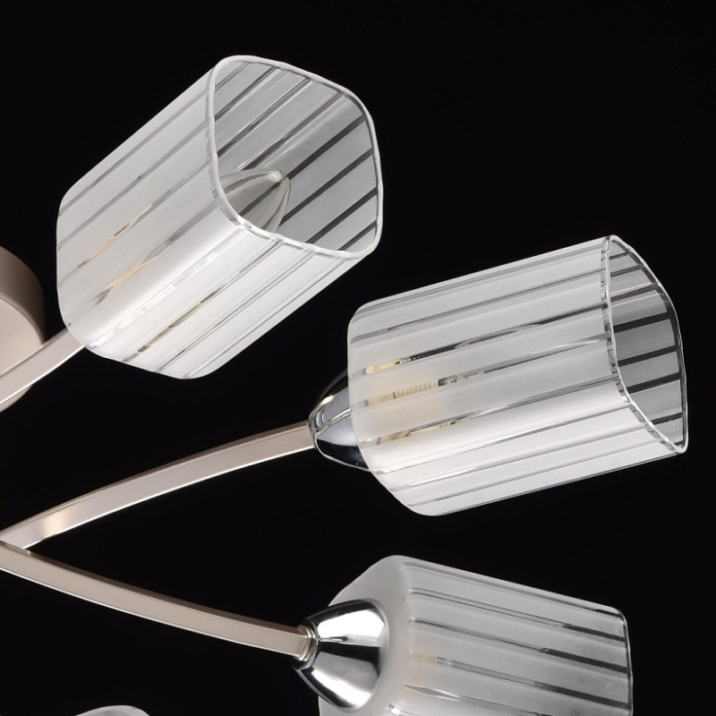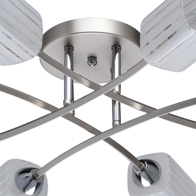 Основание: металл. Потолочная чаша и рожки окрашены в цвет перламутрового серебра, стержни и держатели плафонов - гальванизация в цвет хрома. Потолочная чаша и держатели плафонов изготовлены по технологии обработки на токарном станке. Плафоны: стекло, отлито в форму. Плафоны матированы по трафарету.